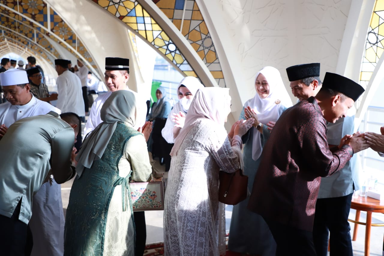 Ribuan masyarakat memadati masjid Al Jabbar dalam pelaksanaan Sholat Idul Fitri 1444 H. Terlihat keceriaan di masing – masing jamaah karena telah melewati puasa yang dilaksanakan sebulan penuh .