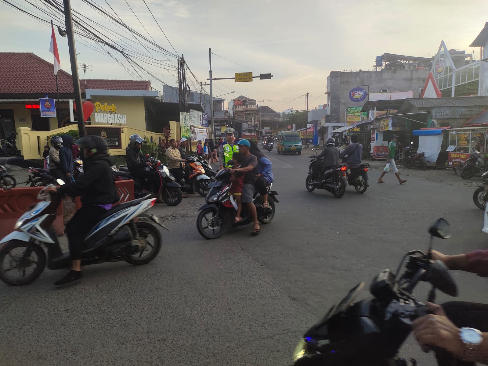 Anggota Unit lalu lintas Polsek Margaasih Aiptu Dadan S., Bripka Ibnu,Bripka Eko Y. Bersama Brigadir Gan Yan. Intens melaksanakan pelayanan pagi hari di Pos Gatur di Depan mako dan di Pos Gatur Pasar Dimensi, pada Sabtu (06/05/2023) pada pukul 07.30 WIB.