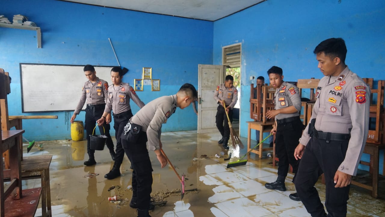 “Upaya membersihkan sekolah ini agar kegiatan belajar mengajar dapat kembali normal, bersih dan nyaman dipakai untuk belajar lagi dan memudahkan pihak sekolah melakukan berish bersih lingkungan akibat dampak banjir, Tandas Kapolres.