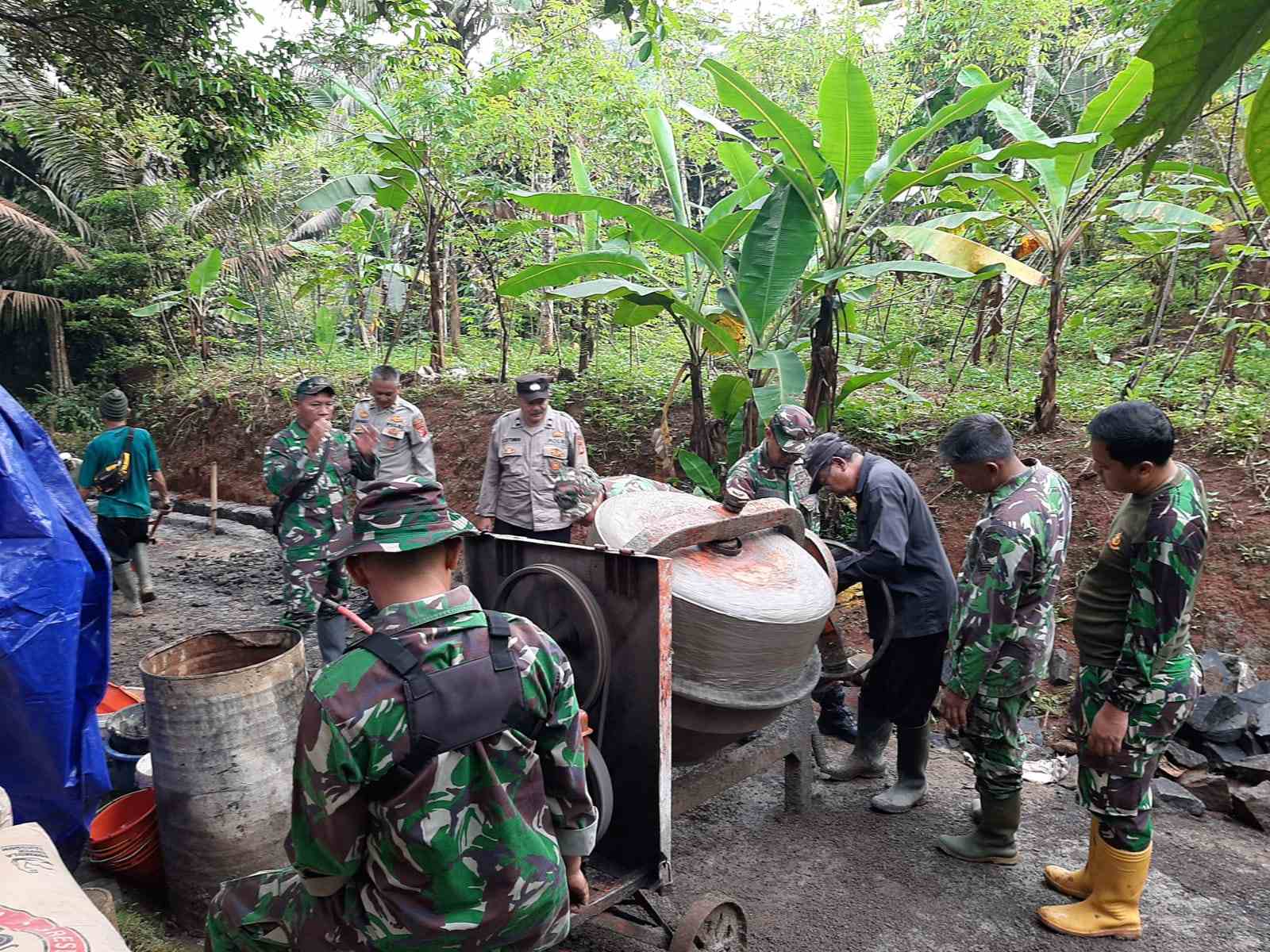 Terlihat Aipda Yoga Koswara gotong royong mengangkut material pembangunan jalan rabat beton di Dusun Ragapulu Rw.013, Desa Jelat.