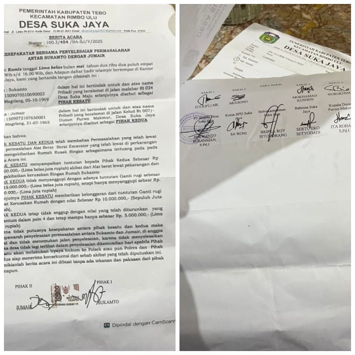 Terkait Sidang yang dibuat dengan berita acara dengan Kop Surat Pemerintahan Desa Suka Jaya Kecamatan Rimbo Ulu dengan berita acara Nomor: 100.3/454/BA-SJ/V/2025 tentang kesepakatan Bersama penyelesaian permasalahan antar Sukamto dengan Jumair, Jumair dituntut oleh Sukamto Rp 15.000.000 akibat dari alat berat masuk pekarangan dan mengakibatkan kerusakan ringan rumah Sukamto.