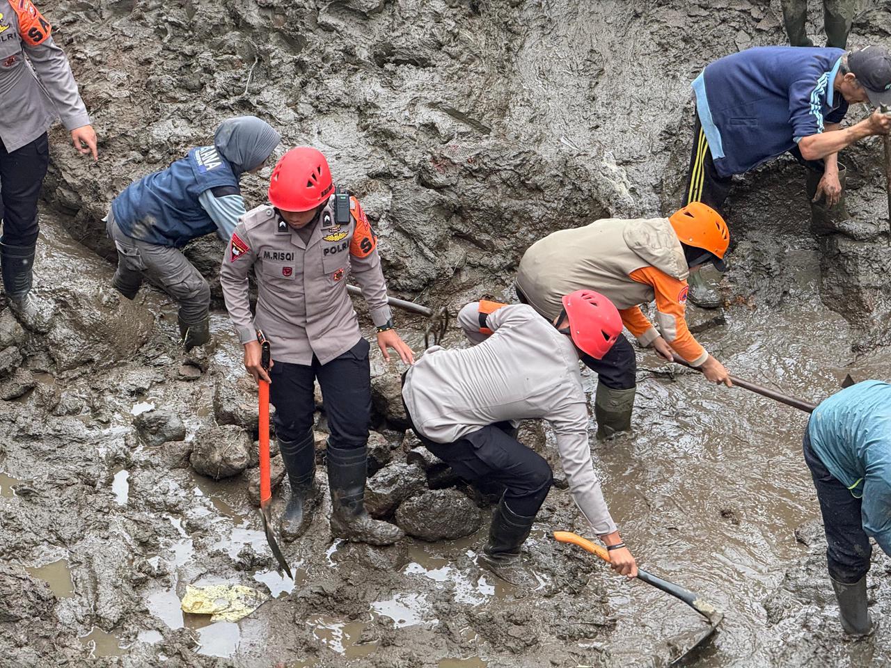 Personel Sat Brimob Polda Jabar yang menggunakan perlengkapan SAR darurat terlihat menyisir aliran sungai yang tersumbat dan membersihkan jalur air dari material longsoran. Upaya pencarian terus dilakukan dengan harapan korban dapat ditemukan secepat mungkin, baik dalam kondisi selamat maupun tidak.