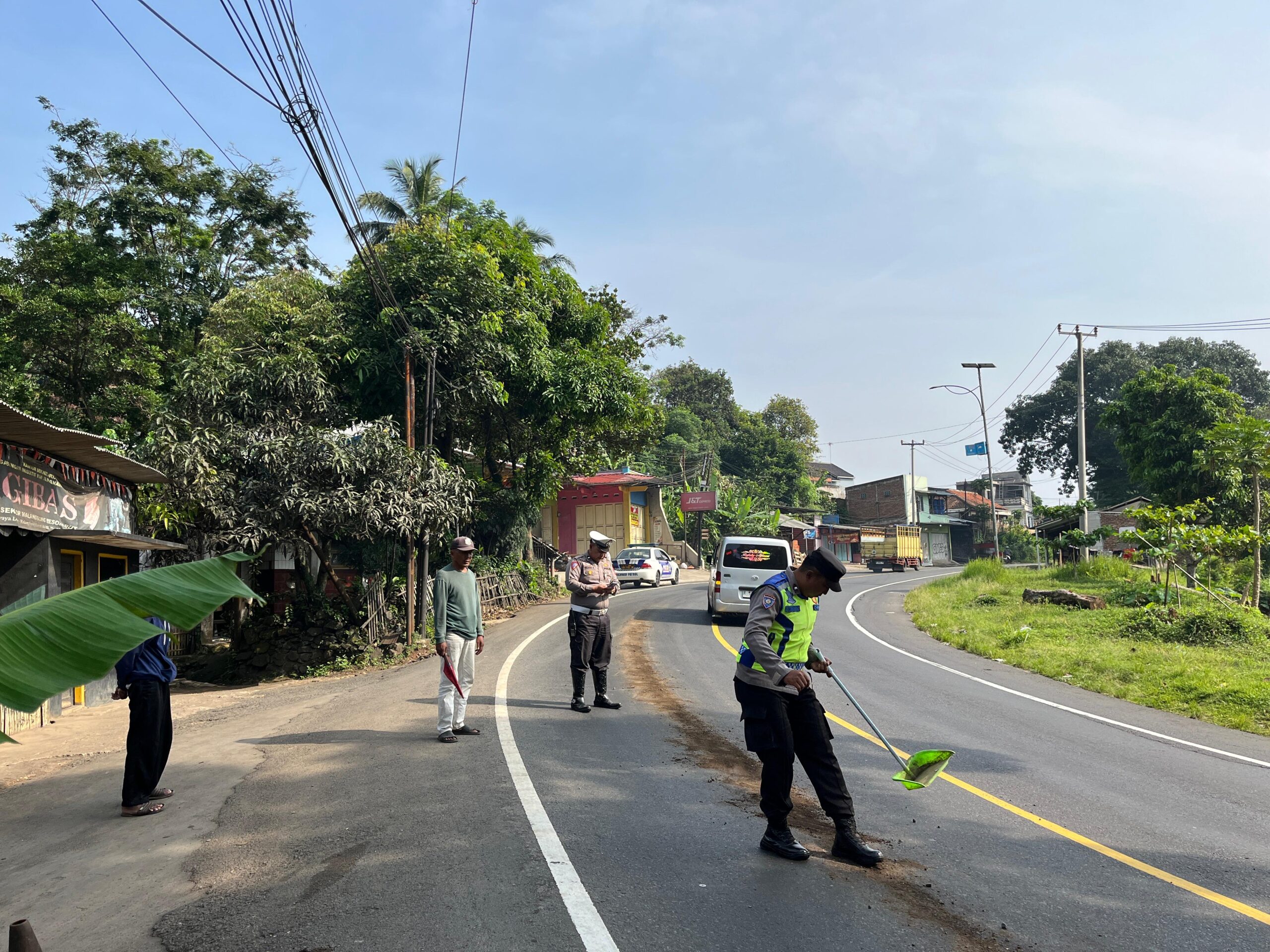 Mendapat laporan adanya kondisi jalan yang licin dan rawan kecelakaan, personel Polsek Malangbong langsung turun ke lokasi melakukan langkah pencegahan.