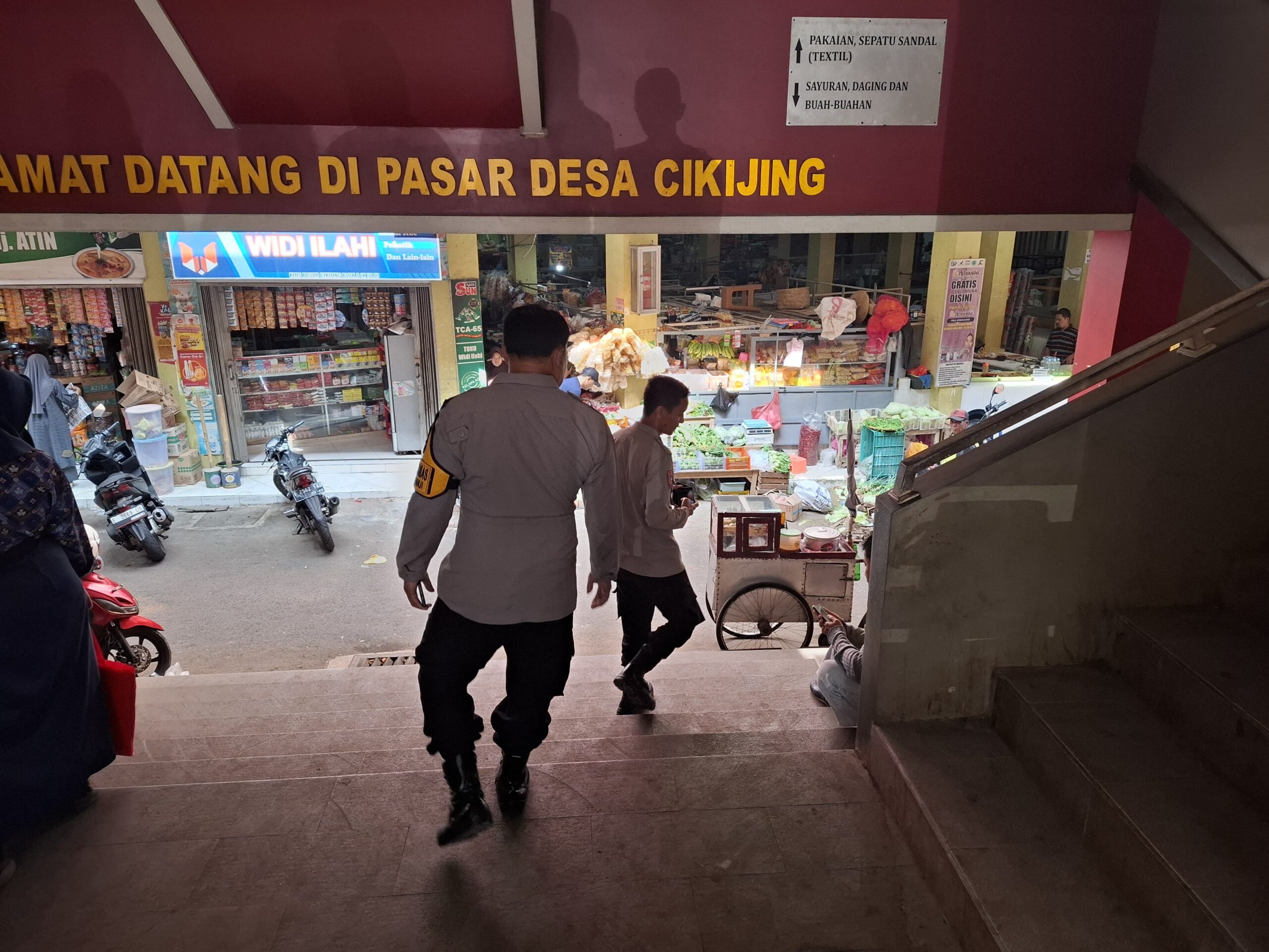 Majalengka – Bhabinkamtibmas Polsek Cikijing Polres Majalengka Polda Jabar Bripka Achmad Supriyono dan Bripka Dede Arif melaksanakan patroli serta menyapa para pedagang dan pengunjung Pasar Cikijing, Senin (16/06/2025).