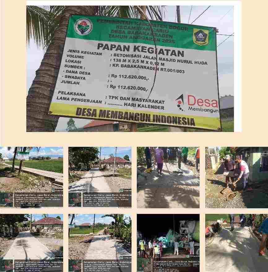 Bogor – ReformasiAktual.com | Pemerintah Desa (Pemdes) Babakanraden, Kecamatan Cariu, Kabupaten Bogor, telah menyelesaikan proyek pembangunan jalan lingkungan (betonisasi) yang berlokasi di Gang Masjid Nurul Huda, Kampung Babakanraden RT 001/RW 003.