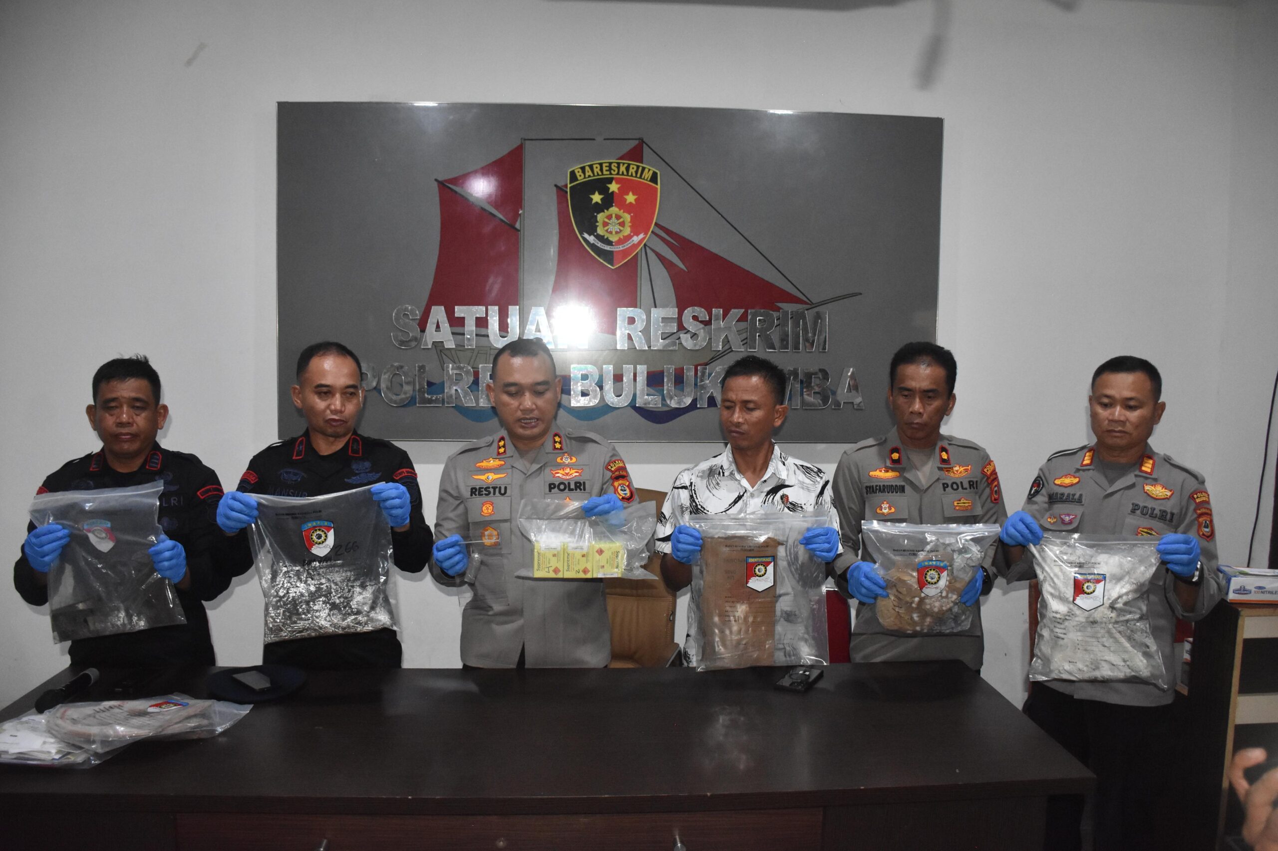 Konferensi pers tersebut dihadiri Kapolres Bulukumba AKBP Restu Wijayanto, S.I.K., didampingi Waka Polres Kompol Syafaruddin, Kasat Reskrim Iptu Muhammad Ali, Kaden Gegana Kompol Mansyur, S.H., M.H., dan Kasubden Jibom AKP Syamsuddin.