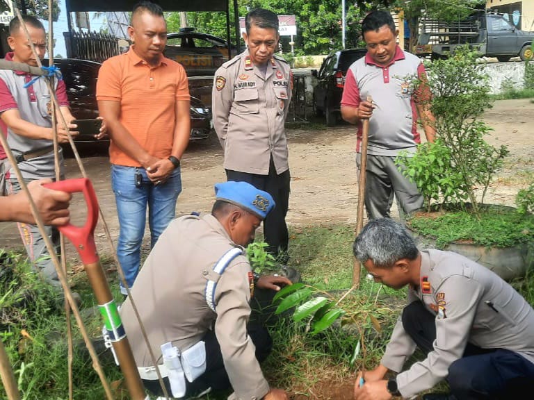 Kapolsek Mappakasunggu Pimpin Langsung Aksi Penghijauan, Tanam Bibit Durian di Pekarangan Mako