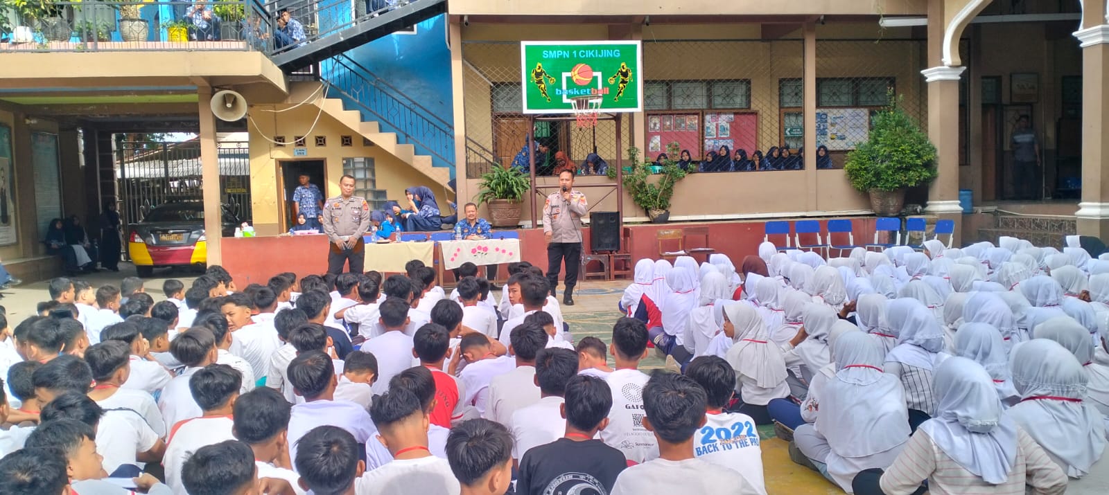 Majalengka – Ps. Panit Lantas Polsek Cikijing Polres Majalengka Polda Jabar Aiptu Ade Deni H. bersama Ps. Panit Samapta II Aiptu Eman Subagja memberikan Pembinaan terkait Masa Pengenalan Lingkungan Sekolah (MPLS) bagi para siswa – siswi SMPN 1 Cikijing, Jum’at (18/07/2025).
