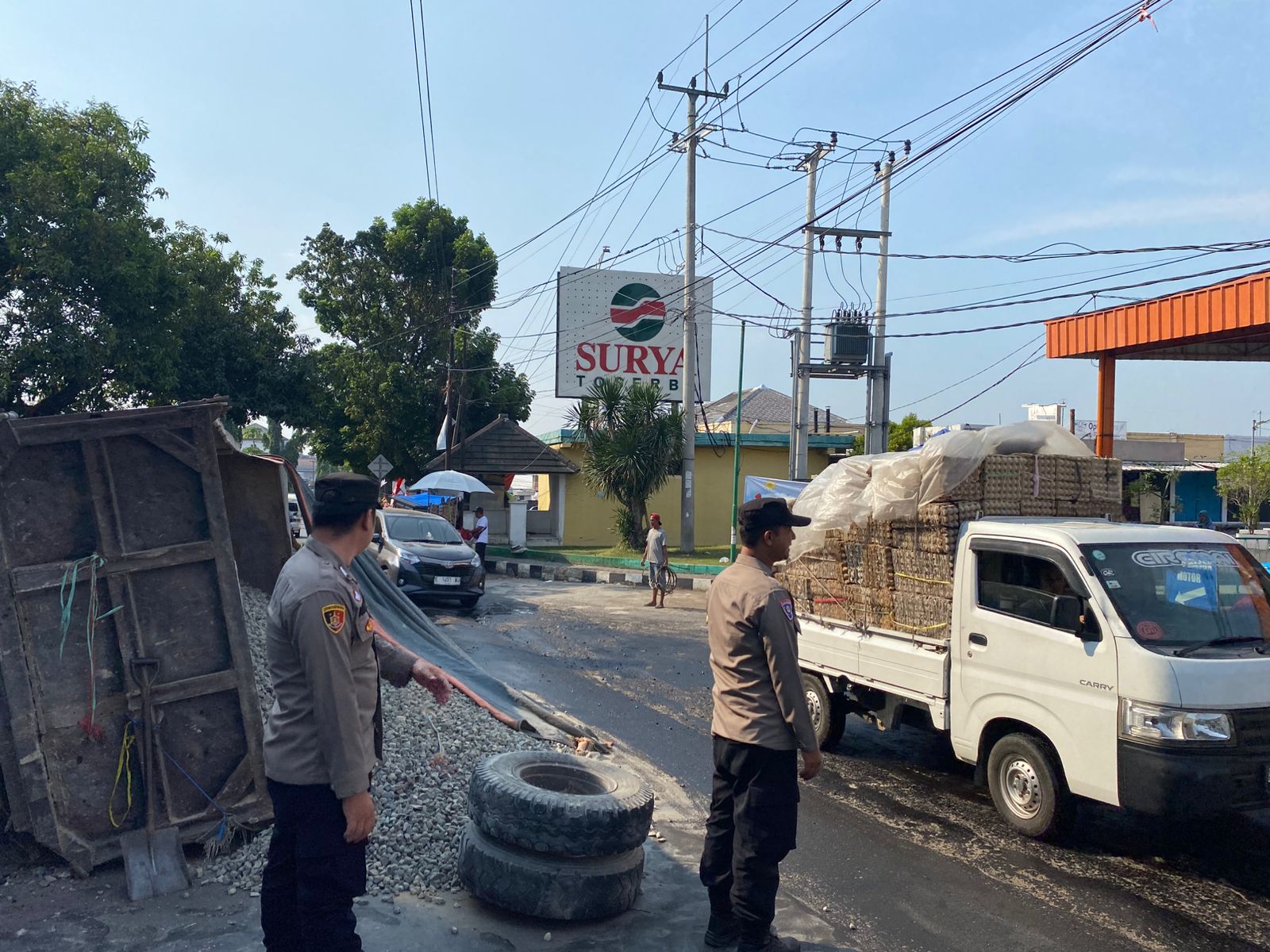 Majalengka – Polsek Kadipaten Polres Majalengka Polda Jabar cepat tanggap dalam menangani peristiwa kecelakaan lalu lintas yang terjadi di Jalan Raya Kadipaten – Majalengka, tepatnya di depan Surya Toserba, Desa Liangjulang, Kecamatan Kadipaten, Kabupaten Majalengka. Peristiwa tersebut melibatkan satu unit truk bermuatan batu split berwarna merah dengan nomor polisi E 8440 BA. Rabu (23/7).