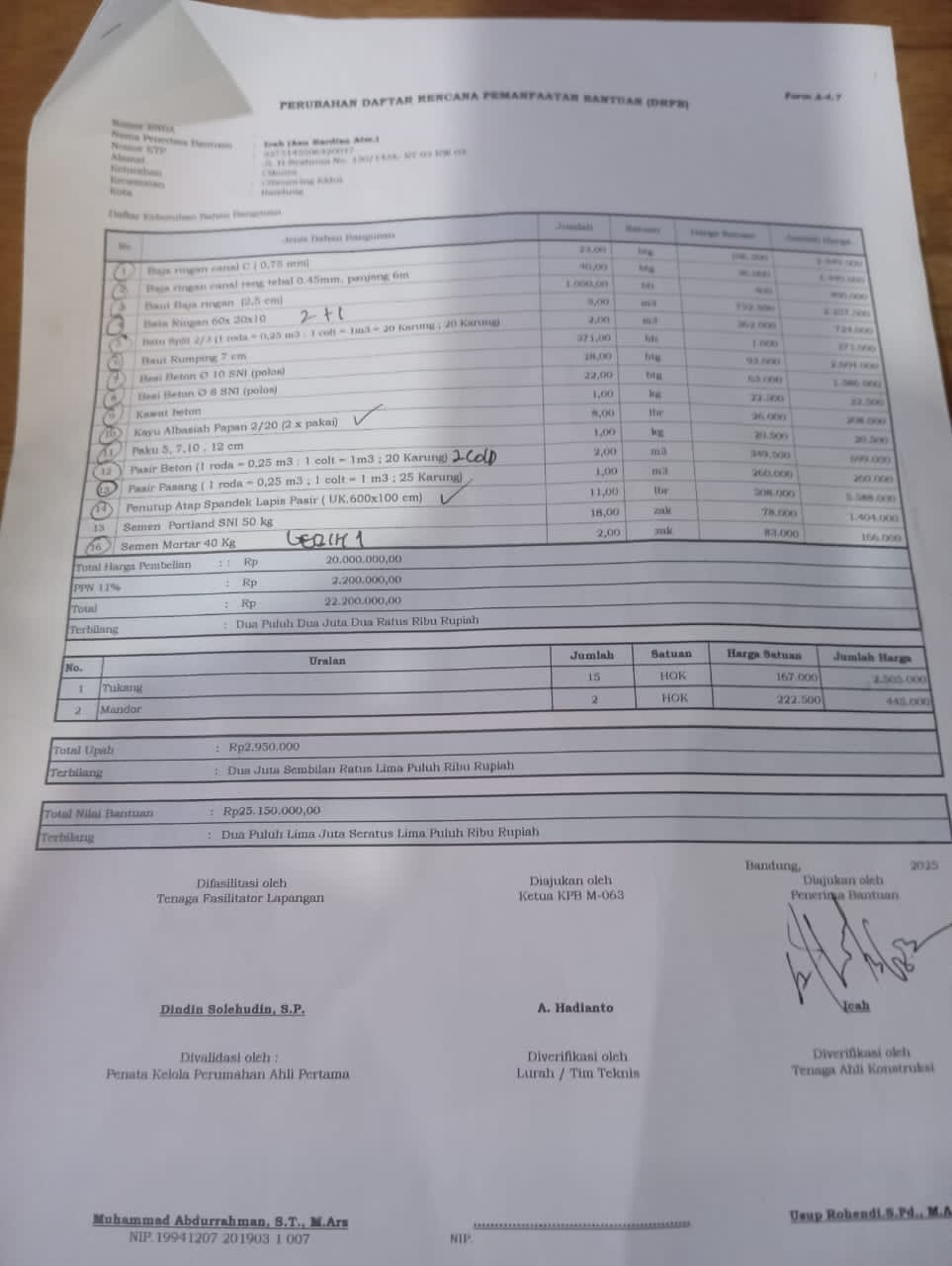 RT 05 RW 03 Bantuan Rutilahu dengan nilai bantuan Rp 25.150.000, tersebut diberikan dalam bentuk material bangunan, meliputi 48 Sak Harusnya merek Porland dengan harga Rp.78 ribu, yang datang ke lokasi yang menerima manfaat menjadi merek semen Rajawali dengan harga 62 ribu Namun