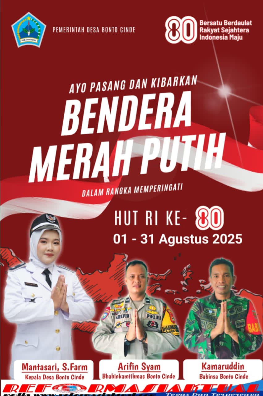 BANTAENG – reformasiaktual.com Pemerintah Desa (Pemdes) Bonto Cinde bersama Babinsa dan Bhabinkamtibmas mengajak warga Desa Bonto Cinde untuk serentak mengibarkan bendera merah putih.