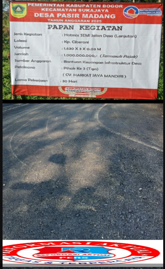 Bogor, Reformasi Aktual.com- Pemerintah Desa Pasir Madang Kecamatan Sukajaya Kabupaten Bogor,Jawa Barat merealisasikan program Bantuan Keuangan Infrastruktur Desa ( BANKEU ) dari bantuan keuangan infrastruktur Kabupaten Bogor tahun 2025, membangun Hotmix Jalan Desa untuk masyarakat Desa Pasir Madang.