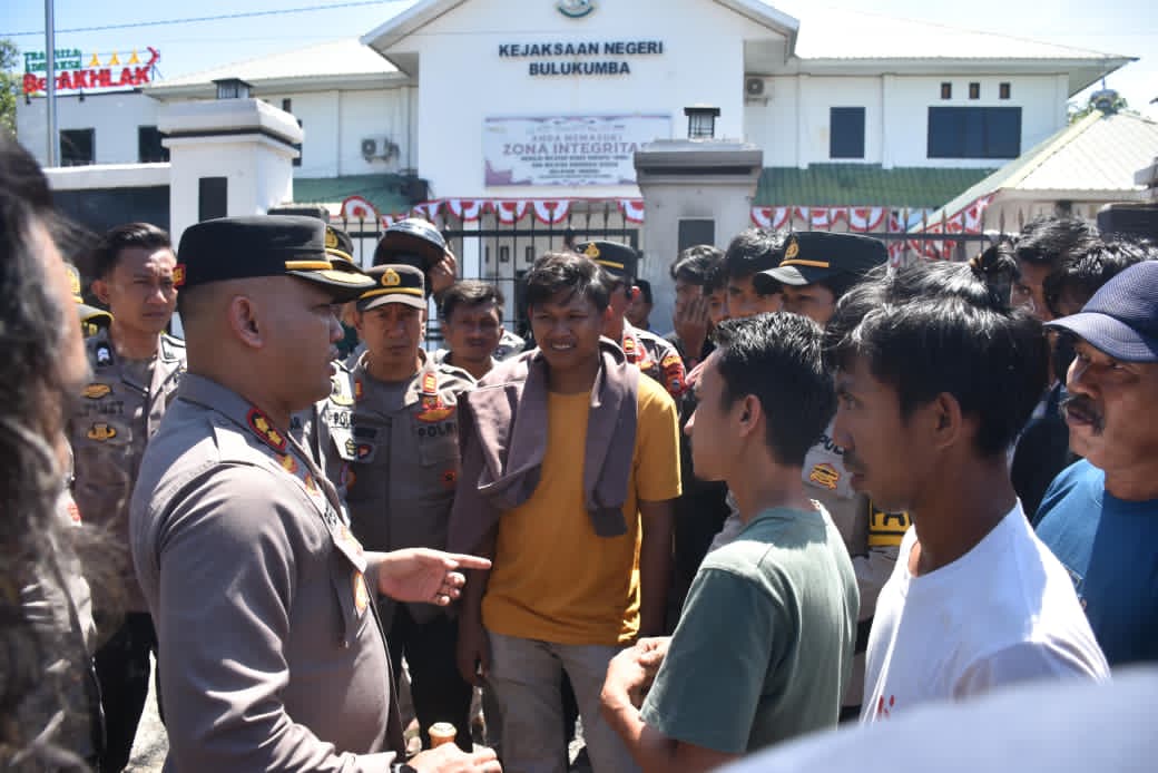 BULUKUMBA – Kapolres Bulukumba AKBP Restu Wijayanto, S.I.K. turun langsung menenangkan warga yang menggelar aksi unjuk rasa di depan Kantor Kejaksaan Negeri Bulukumba pada Selasa, 5 Agustus 2025 kemarin.