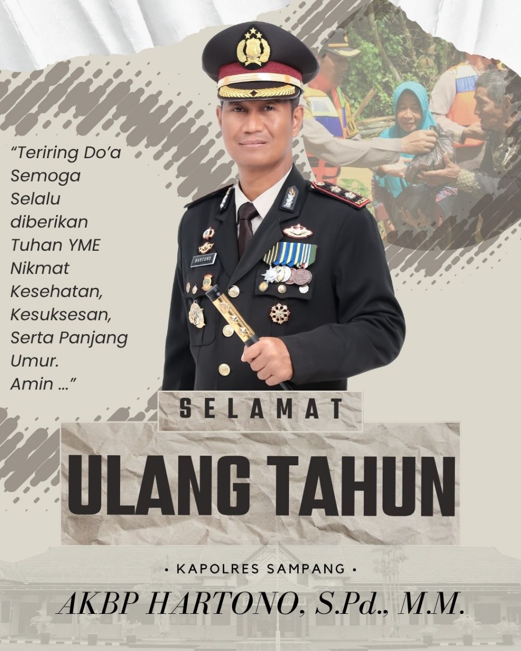 SAMPANG, 6 Agustus 2025 — Dalam rangka memperingati hari ulang tahun Kapolres Sampang, AKBP Hartono, S.Pd., M.M., yang jatuh pada hari ini, Selasa, 6 Agustus 2025, Pimpinan Redaksi Media Tintahukum dan Kabarbangsa turut menyampaikan ucapan selamat serta doa terbaik bagi kelangsungan tugas dan pengabdian beliau.