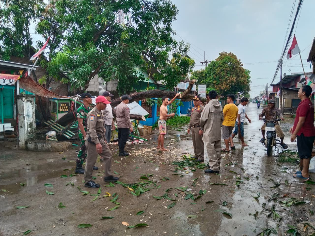 Bhabinkamtibmas Polsek Sliyeg Aipda Ade C bersama Bripka Boby, Babinsa Serma Rastika, dan anggota Satpol PP Mp Yanto langsung melakukan pembersihan batang dan ranting pohon, serta mengamankan lokasi agar warga dapat kembali melintas dengan aman.