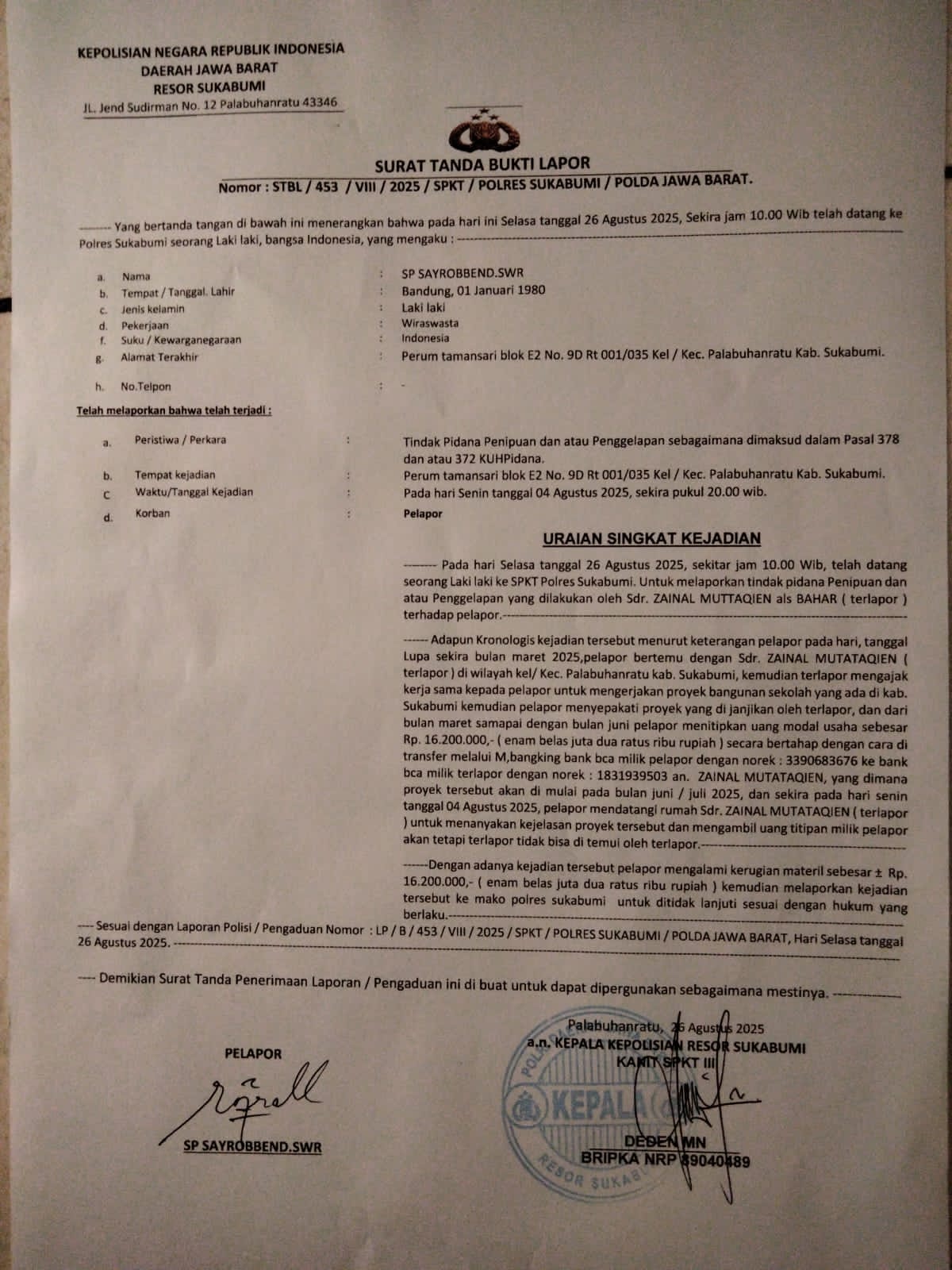 Merasa ditipu dan dipermainkan, korban pun melapor ke Polres Sukabumi. Laporan resmi telah diterima pihak kepolisian, disertai bukti percakapan antara korban dan terlapor.