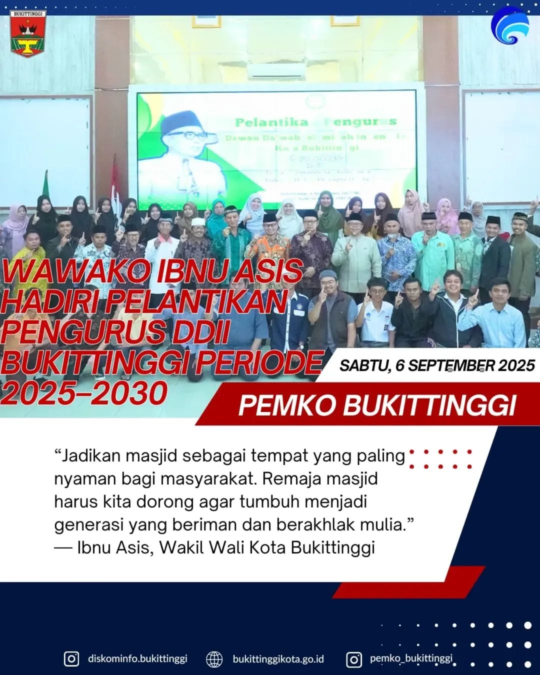 Wakil Wali Kota Bukittinggi, Ibnu Asis, menegaskan pentingnya peran kepengurusan baru dalam menjalankan amanah dakwah. Ia mengingatkan bahwa masjid tidak hanya berfungsi sebagai tempat ibadah, tetapi juga sebagai pusat kegiatan umat sekaligus ruang kebersamaan bagi masyarakat.