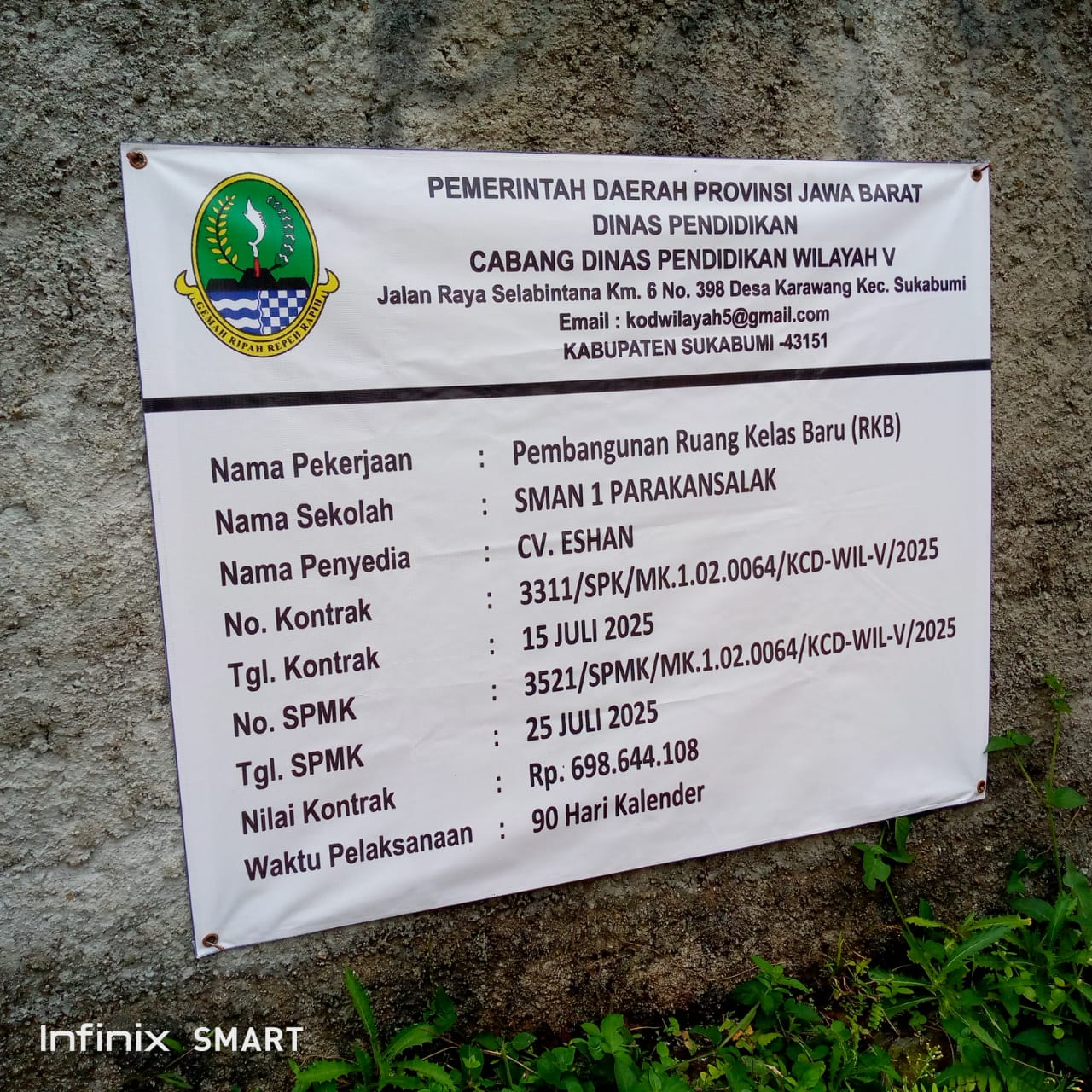 Dari hasil Pantauan awak Media, SMAN 1 PARAKAN SALAK desa Parakansalak kecamatan Parakansalak kab. Sukabumi Jawa Barat. Mendapat Bantuan Dari Pemprov. Jawa Barat melalui Dana Alokasi Khusus (DAK) senilai Rp. 698.644.108.-