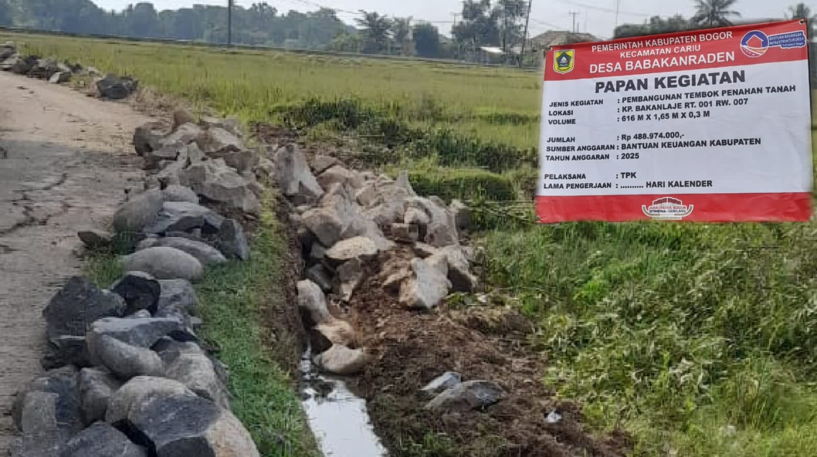 Bogor, Reformasiaktual.com – Pemerintah Desa Babakanraden, Kecamatan Cariu, Kabupaten Bogor, terus menunjukkan komitmennya dalam meningkatkan kesejahteraan masyarakat melalui pembangunan infrastruktur. Pada tahun 2025 ini, melalui Program Bantuan Keuangan Kabupaten (Bankeu), desa tersebut tengah merealisasikan pembangunan Tembok Penahan Tanah (TPT) dan pengaspalan jalan.