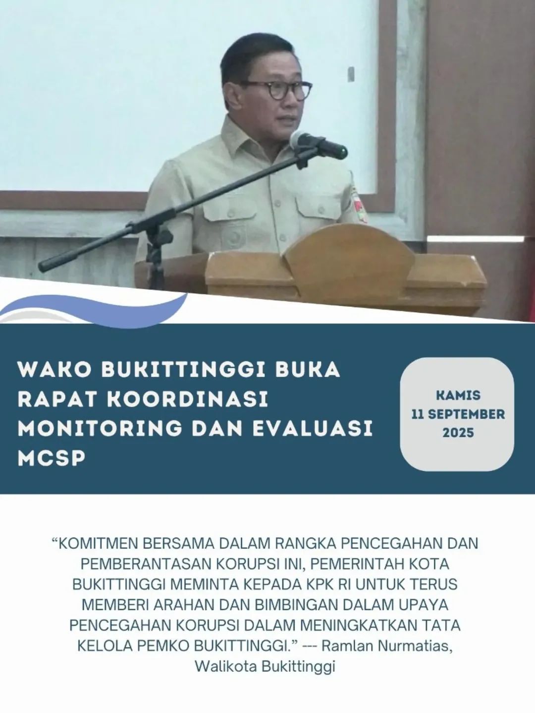 Reformasiaktual.com//Bukittinggi — Pemerintah Kota Bukittinggi gelar Rapat Koordinasi Monitoring dan Evaluasi Monitoring Controlling Surveillance for Prevention (MCSP). Kegiatan ini dibuka langsung oleh Wali Kota Bukittinggi, Ramlan Nurmatias di Hall Balai Kota, Kamis 11 September 2025.