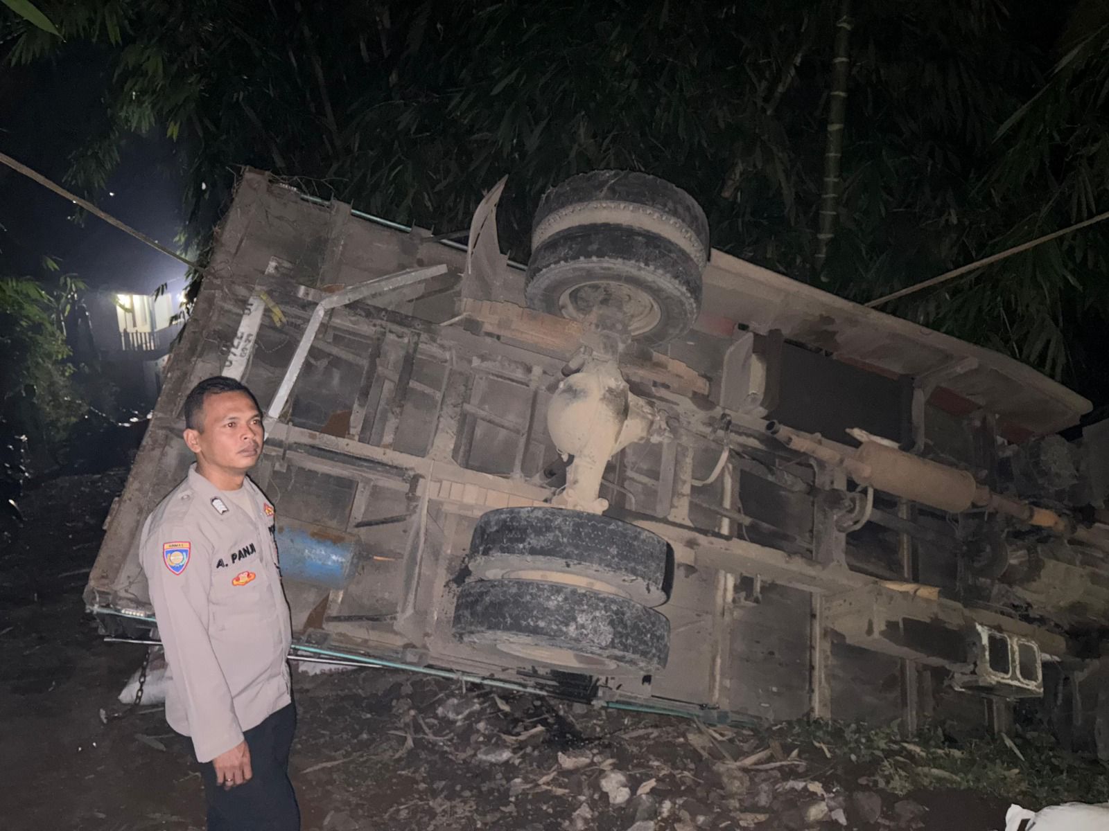Truk bermuatan pupuk kandang tersebut mengalami patah as roda saat melaju di tanjakan. Akibatnya, kendaraan kehilangan kendali, rem tidak berfungsi, dan akhirnya mundur hingga terjungkal ke sisi kiri jalan. Beruntung, sang sopir selamat tanpa mengalami luka.