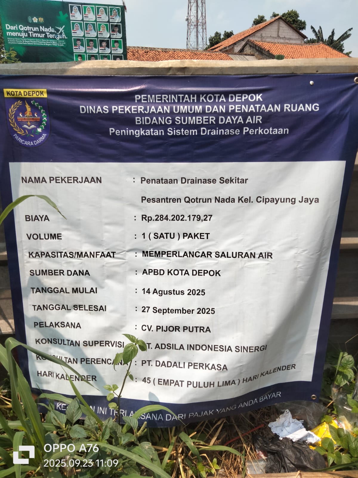 Depok_23 september 2025_Proyek drainase dengan nilai Rp284.202.179,27 dari APBD Kota Depok 2025 yang dikerjakan di lingkungan Pesantren Qotrun Nada, Kelurahan Cipayung Jaya, Kecamatan Cipayung, Kota Depok, terbengkalai alias mangkrak. Proyek yang seharusnya menjadi solusi justru berubah menjadi ancaman bagi keselamatan warga, terutama anak sekolah yang melintas setiap hari.