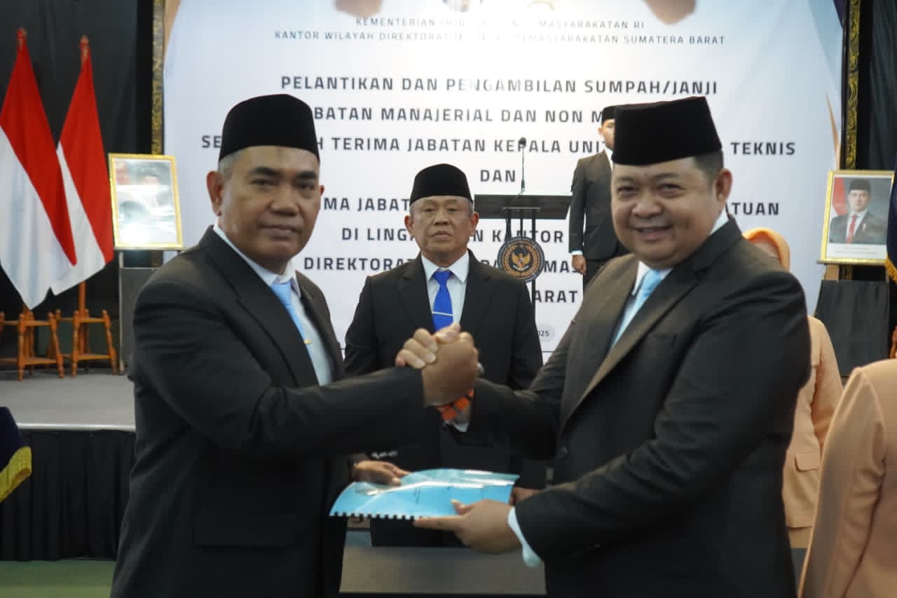 Bukittinggi, Reformasiaktual.com – Kantor Wilayah Ditjen Pas Sumatera Barat menggelar kegiatan pelantikan dan pengambilan sumpah jabatan manajerial dan non-manajerial, sekaligus serah terima jabatan (sertijab) Kepala Unit Pelaksana Teknis (UPT) di lingkungan Pemasyarakatan Sumatera Barat, Jumat (26/9).