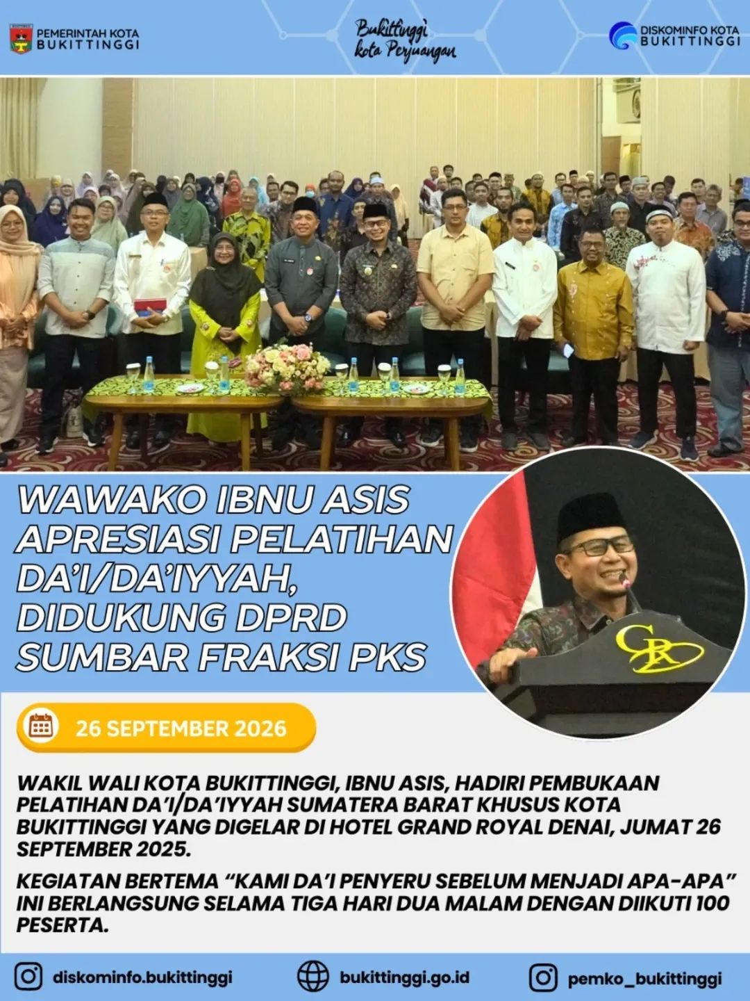 Reformasiaktual.com//Bukittinggi — Wakil Wali Kota Bukittinggi, Ibnu Asis, hadiri pembukaan Pelatihan Da’i/Da’iyyah Sumatera Barat khusus Kota Bukittinggi yang digelar di Hotel Grand Royal Denai, Jumat 26 September 2025. Kegiatan bertema “Kami Da’i Penyeru Sebelum Menjadi Apa-Apa” ini berlangsung selama tiga hari dua malam dengan diikuti 100 peserta.