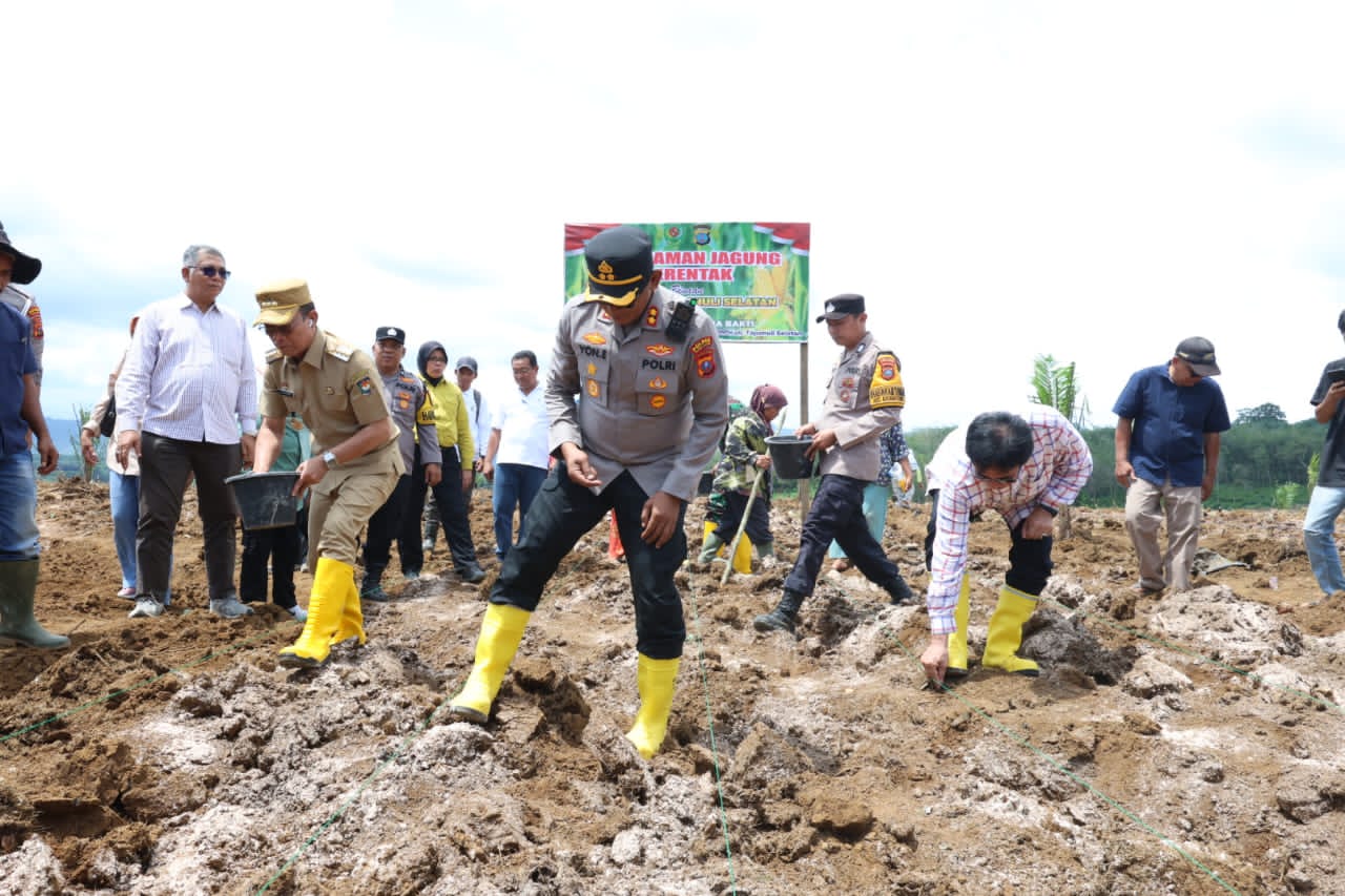 Di lokasi, unsur Forkopimda bersama Kelompok Tani melakukan penanaman bibit jagung secara simbolis. Setelah simbolisasi, kegiatan penanaman dilanjutkan oleh Kelompok Tani Mulia Bakti hingga rampung.