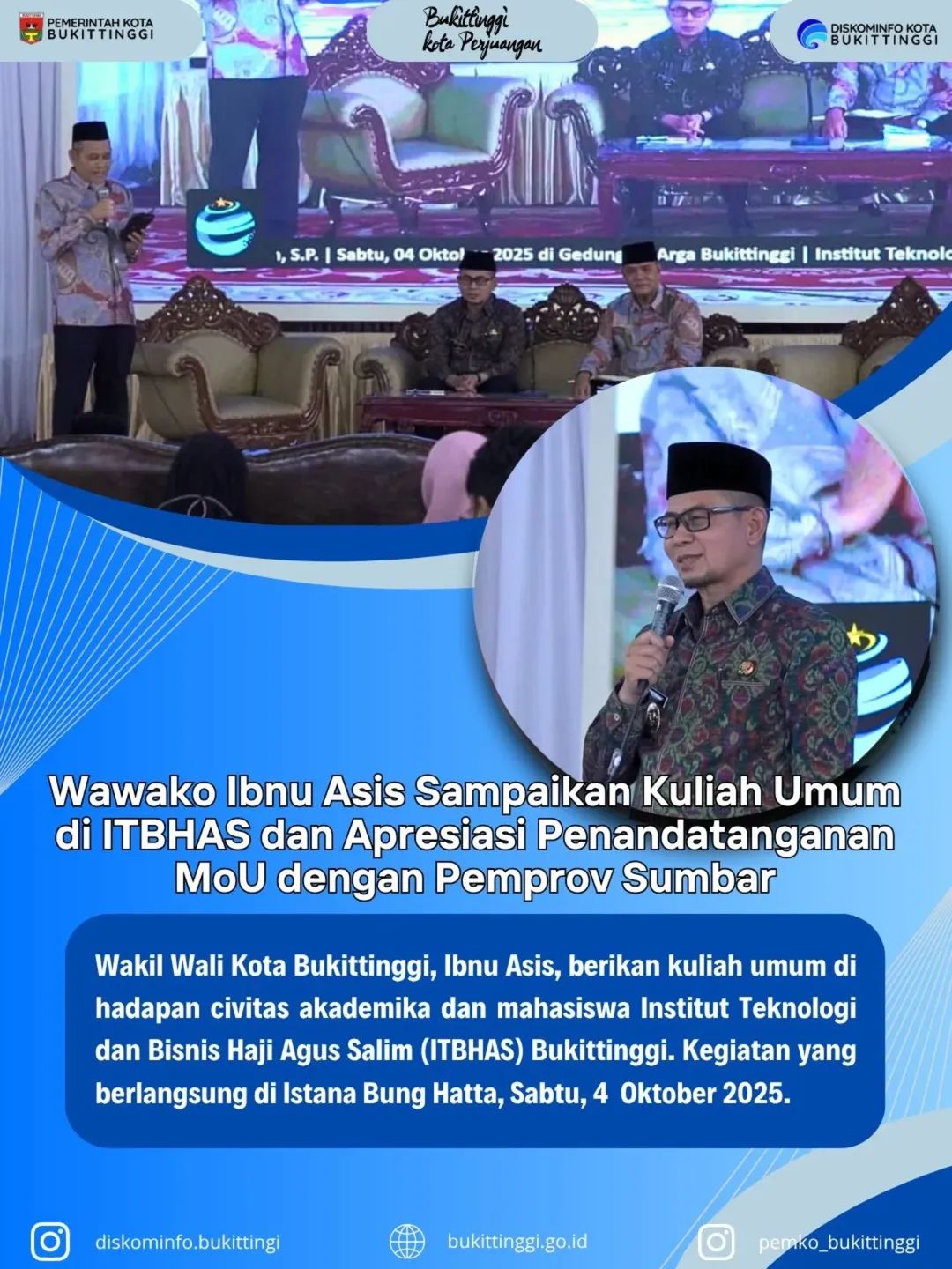 Reformasiaktual.com//Bukittinggi — Wakil Wali Kota Bukittinggi, Ibnu Asis, berikan kuliah umum di hadapan civitas akademika dan mahasiswa Institut Teknologi dan Bisnis Haji Agus Salim (ITBHAS) Bukittinggi. Kegiatan yang berlangsung di Istana Bung Hatta, Sabtu, 4 Oktober 2025.