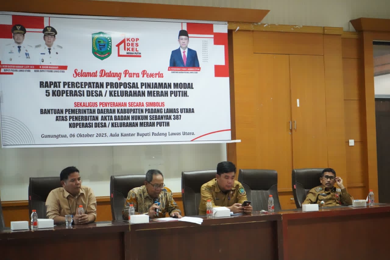 Paluta// ReformasiAktual.com- Wakil Bupati Padang Lawas Utara Basri Harahap Memimpin Rapat Percepatan Proposal Pinjaman Modal Lima Koperasi Desa/Kelurahan Merah Putih Kabupaten Padang Lawas Utara di Ruang Rapat Bupati, Senin (06/10/2025).