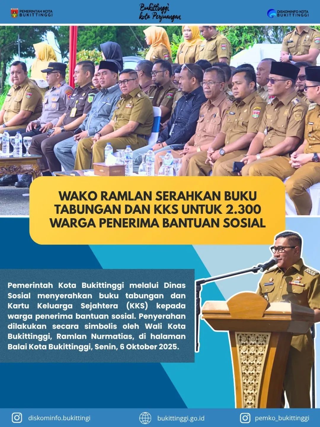 Reformasiaktual.com//Bukittinggi — Pemerintah Kota Bukittinggi melalui Dinas Sosial menyerahkan buku tabungan dan Kartu Keluarga Sejahtera (KKS) kepada warga penerima bantuan sosial. Penyerahan dilakukan secara simbolis oleh Wali Kota Bukittinggi, Ramlan Nurmatias, di halaman Balai Kota Bukittinggi, Senin, 6 Oktober 2025.