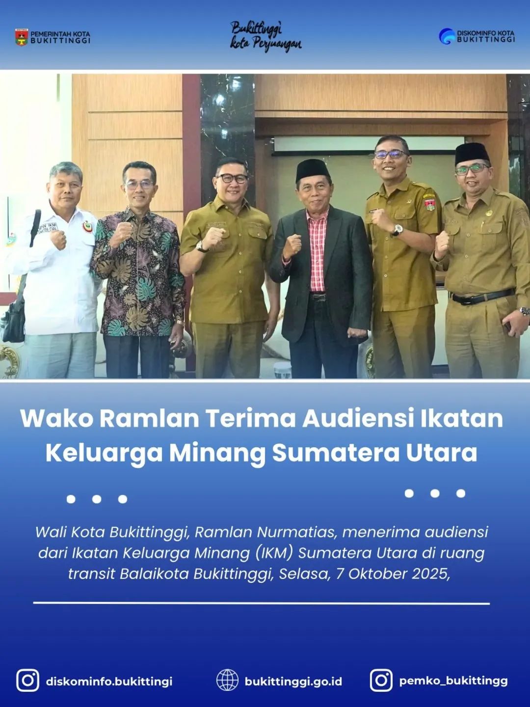 Reformasiaktual.com//Bukittinggi — Wali Kota Bukittinggi, Ramlan Nurmatias, menerima audiensi dari Ikatan Keluarga Minang (IKM) Sumatera Utara di ruang transit Balaikota Bukittinggi, Selasa, 7 Oktober 2025,