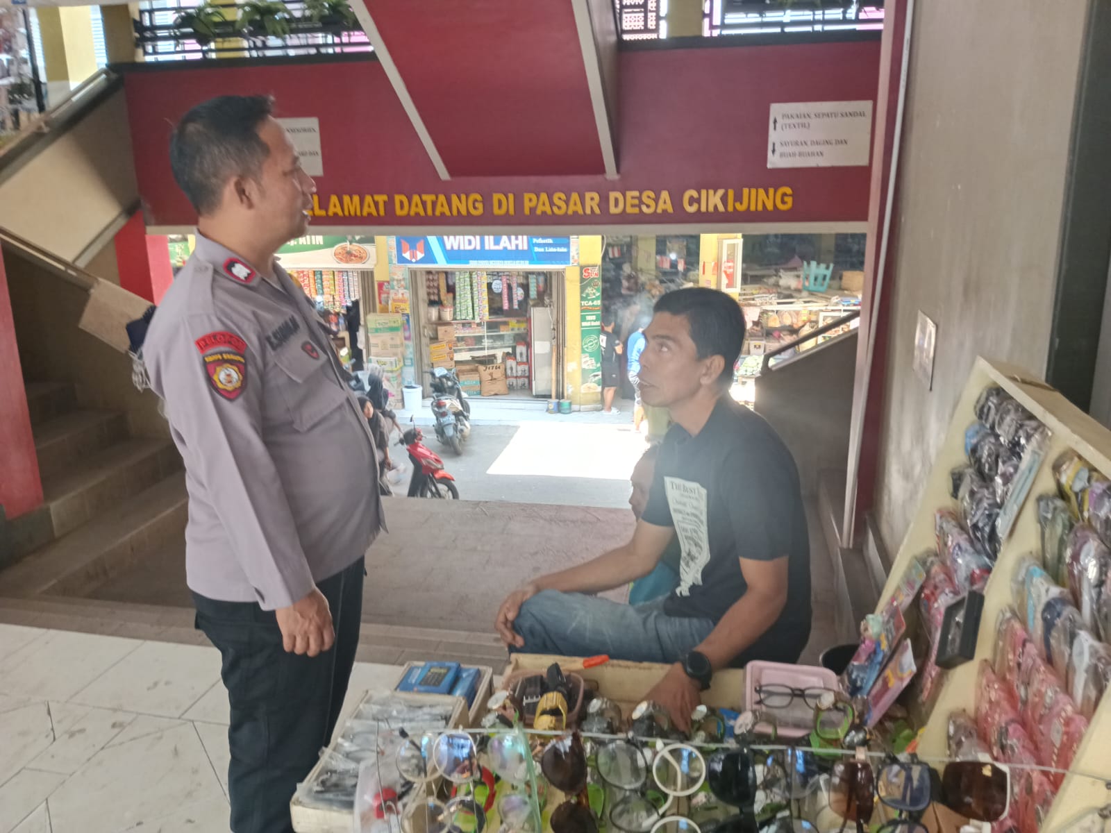 Majalengka – Personil Polsek Cikijing, Polres Majalengka, Polda Jabar, terus berupaya menjaga kondusifitas wilayah dengan mendekatkan diri kepada masyarakat. Kali ini Ps. Panit Samapta l Aiptu Eman Subagja melaksanakan patroli dan menyambangi para pedagang di Pasar Cikijing, Kecamatan Cikijing, Kabupaten Majalengka, Minggu (19/10/2025).