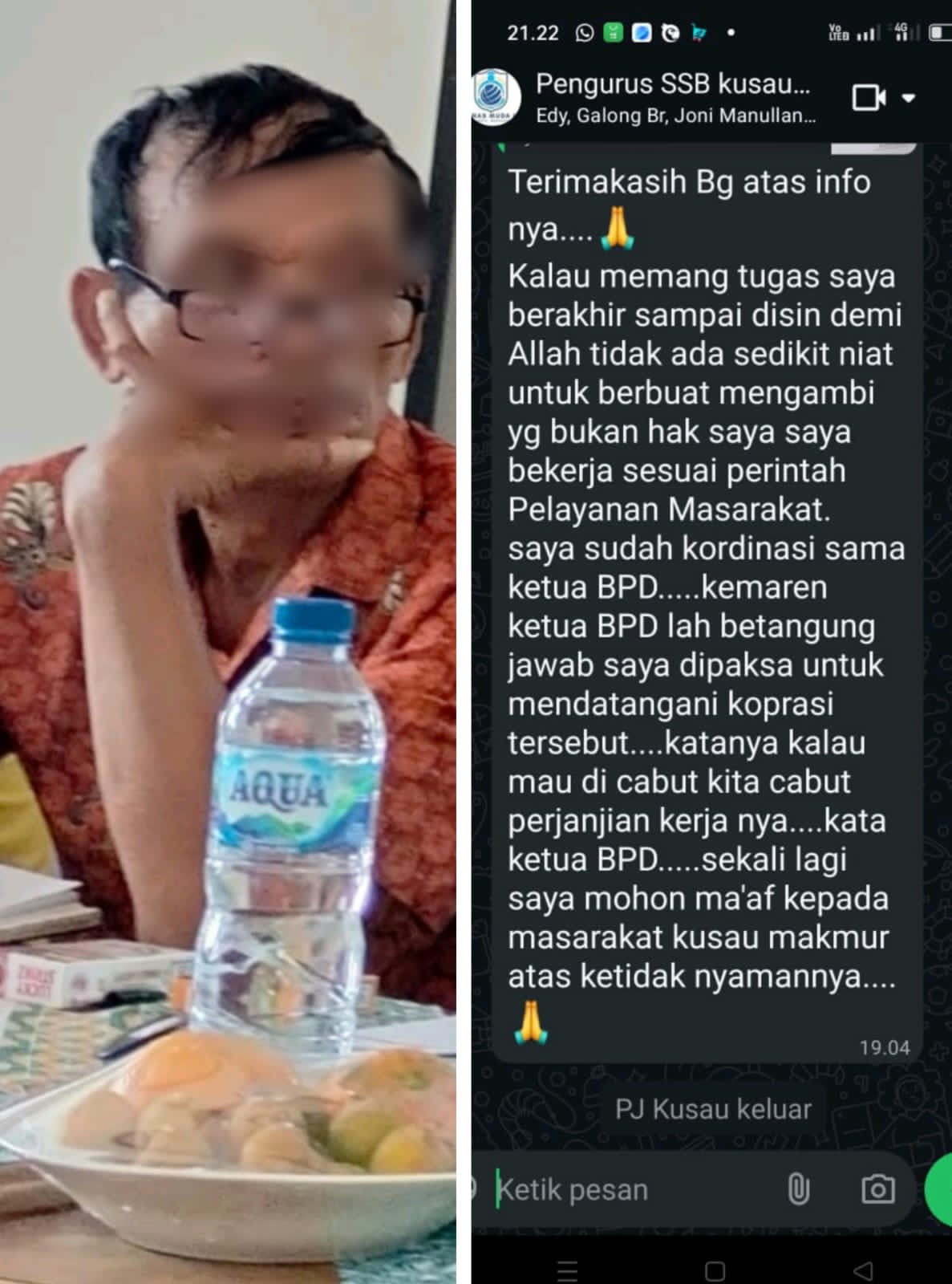 “Saya sudah koordinasi sama Ketua BPD… kemarin Ketua BPD lah bertanggung jawab, saya dipaksa menandatangani koperasi tersebut. Katanya kalau mau dicabut, kita cabut perjanjian kerja nya,” tulis Jaka dalam pesan WhatsApp yang tersebar luas pada Jumat (17/10/2025).