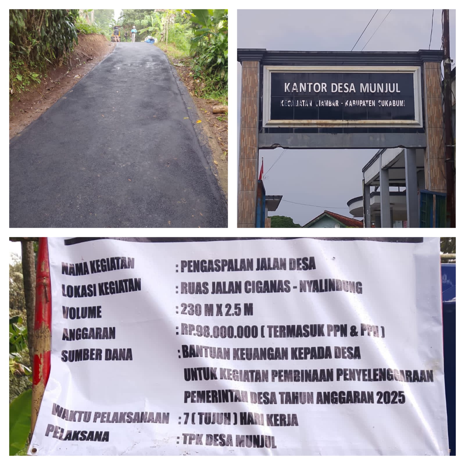 Reformasiaktual.com//Sukabumi  – Pemerintah Desa munjul , Kecamatan ciambar , Kabupaten sukabumi , sukses melaksanakan pembangunan pengaspalan jalan desa di Kampung Ciganas- Nyalindung. Pekerjaan ini memiliki volume panjang meter, lebar 230 meter, x 2.5 dengan total anggaran sebesar Rp 98.000.000 – termasuk PPN dan PPh yang bersumber dari Bantuan Keuangan (BanKeu) Tahun Anggaran 2025.