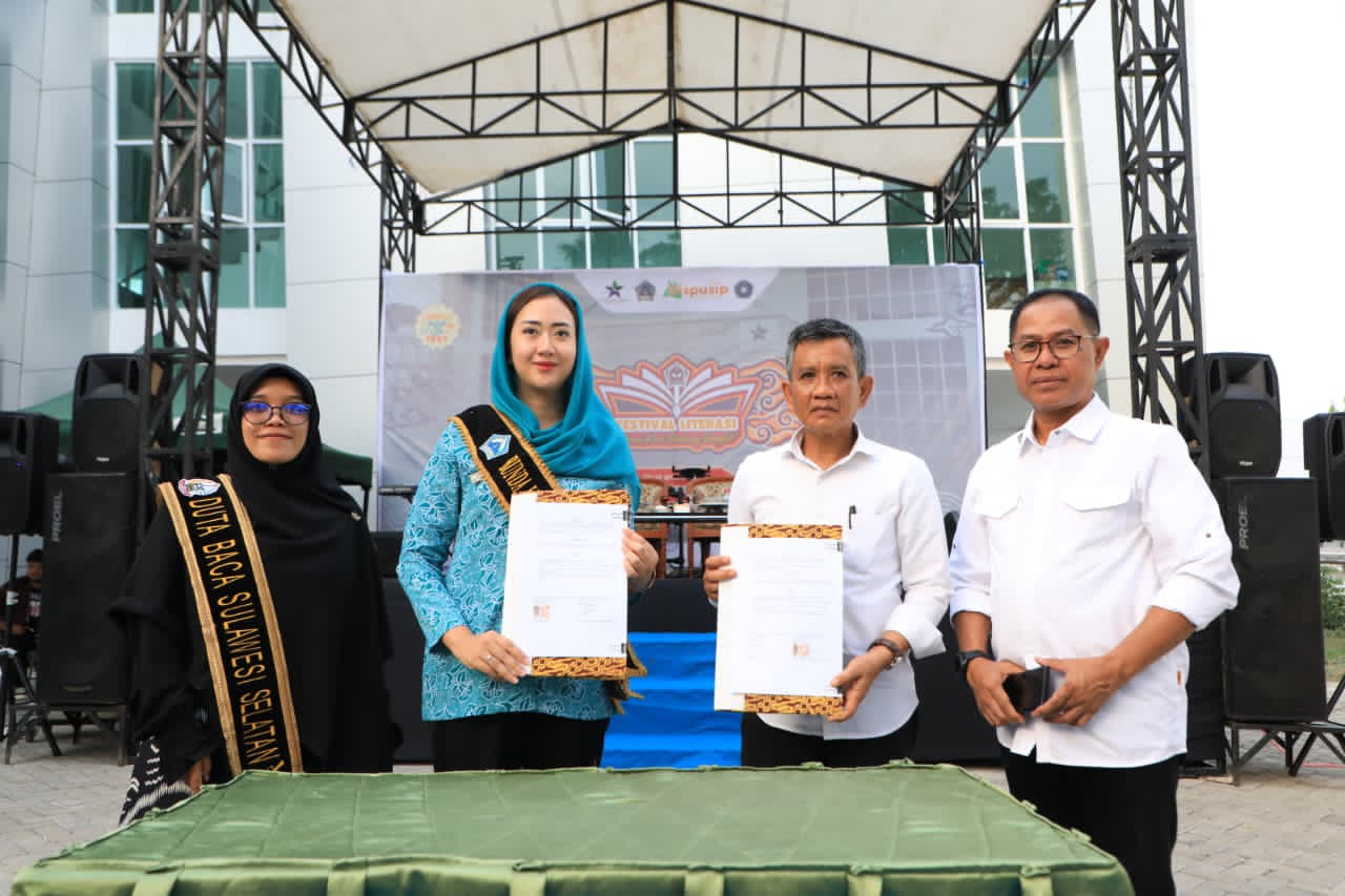 Kepala Dinas Perpustakaan dan Kearsipan Provinsi Sulawesi Selatan, Prof. Dr. Muhammad Jufri, serta Duta Baca Provinsi Sulawesi Selatan, Ramlah yang juga merupakan narasumber dr gelar wicara tersebut.