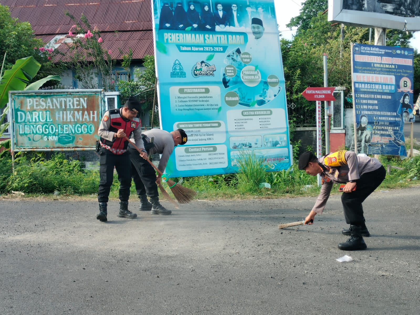 Sinjai – Sat Samapta Polres Sinjai membersihkan batu kerikil yang berserakan di badan jalan tepatnya di pertigaan jalan persatuan raya (pasar biringere) Kelurahan Biringere. Kecamatan Sinjai Utara Sinjai, Kabupaten Sinjai. Kamis (6/11/2025) pagi