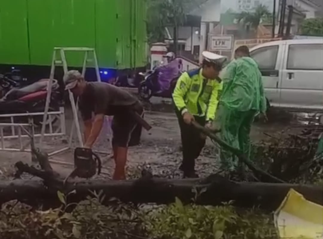 Anggota jaga Polsek Jatiwangi Polres Majalengka AIPDA Diding dan Bripka Visma mendapatkan laporan dari warga desa Jatiwangi melaporkan adanya pohon tumbang yang menutup akses jalan dan langsung menuju ke tempat dimana pohon itu tumbang.
