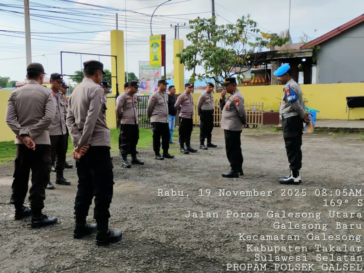 Takalar – Suasana pagi di halaman Mako Polsek Galesong Selatan (Galsel) pada Rabu, (19/11/2025) terasa penuh energi ketika Kapolsek Galsel, AKP Mukhlis, SE., M.Si memimpin langsung apel pagi rutin. Kegiatan yang dimulai pukul 08.00 Wita ini dihadiri oleh Wakapolsek IPDA Amiruddin, para Kanit, serta seluruh personel Polsek Galsel.