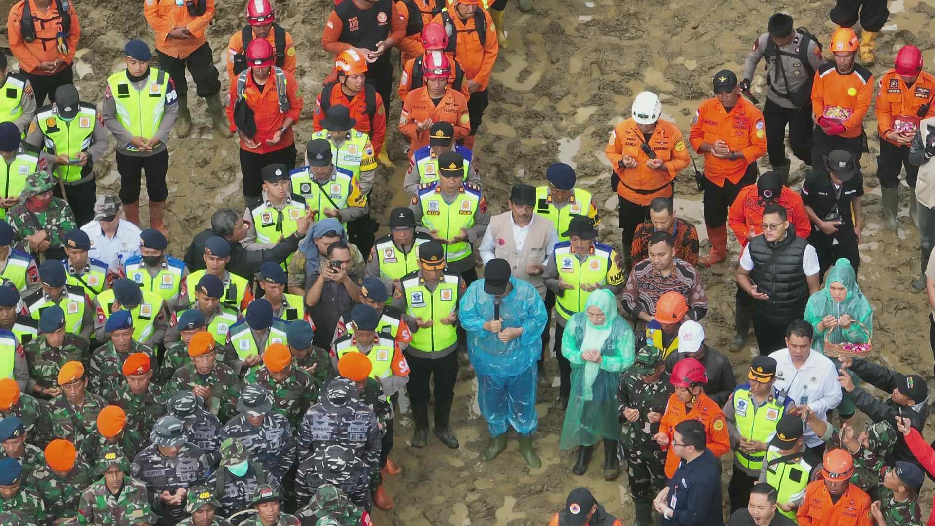 Hujan rintik yang jatuh di lokasi bencana tanah longsor di Dusun Situkung Desa Pandanarum tak menyurutkan langkah para keluarga korban, relawan, dan Forkopimda untuk mengikuti prosesi tabur bunga. Di atas tumpukan material tanah longsor ini, mereka berdiri melingkar, menundukkan kepala, menyatukan doa untuk para korban yang belum ditemukan.