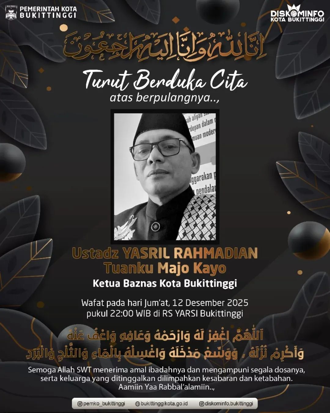 Innalillahi wa inna ilaihi raji’un Pemerintah Kota Bukittinggi menyampaikan duka cita yang mendalam atas wafatnya Almarhum Al Ustadz Yasril Rahmadian Tuanku Majo Kayo, Ketua BAZNAS Kota Bukittinggi periode 2025–2030.