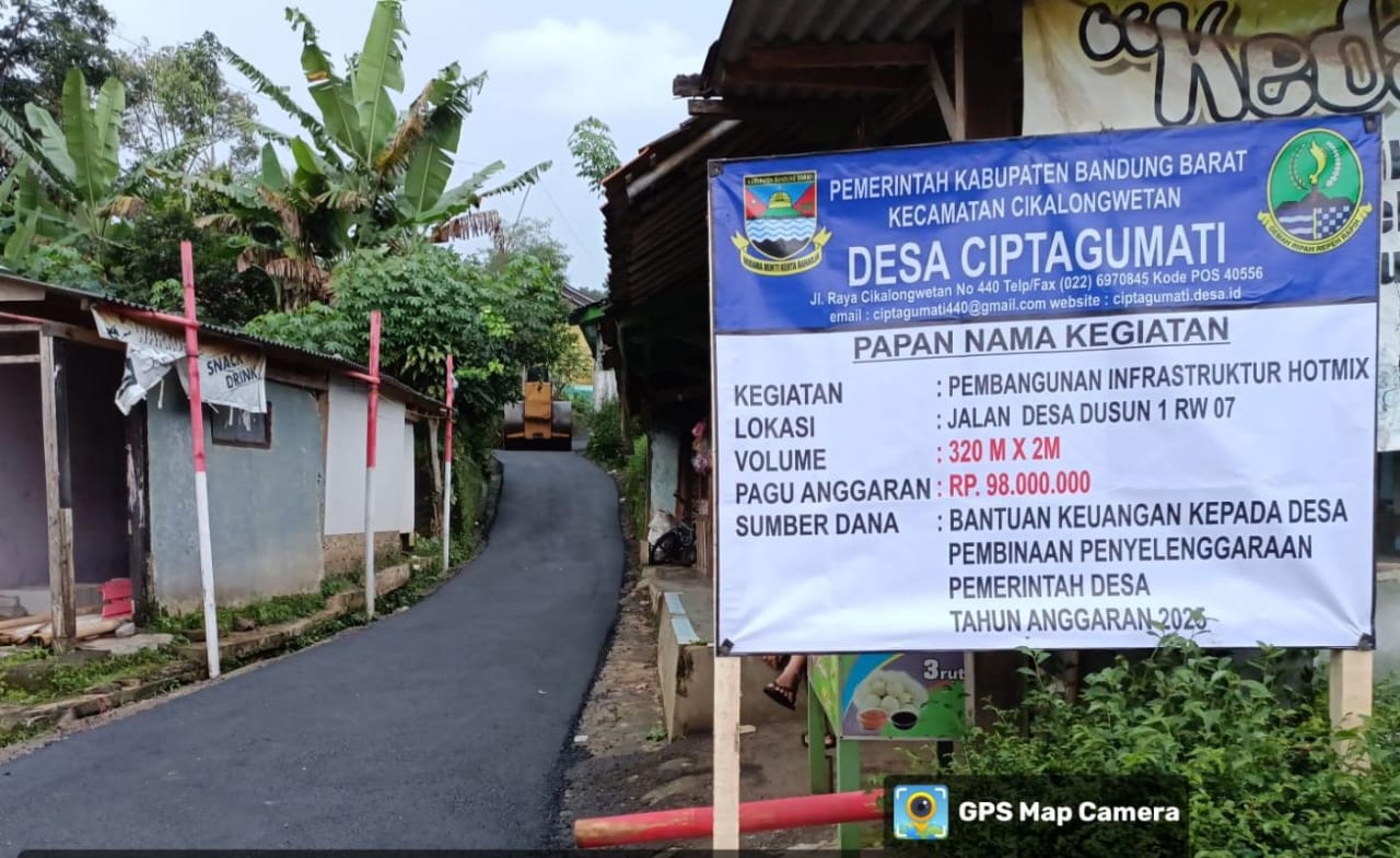 Cikalong – Pemerintah Desa (Pemdes) Ciptagumati, Kecamatan Cikalong , Kabupaten Bandung Barat, Jawa Barat, merealisasikan pembangunan infrastruktur jalan desa melalui kegiatan pengaspalan hotmix di Dusun 01, kampung Cigintung RW 07 dan RW 01, Pekerjaan jalan sepanjang kurang lebih 320 M X 2 M, tersebut bersumber dari Anggaran Dana Bantuan Provinsi Tahun 2025.