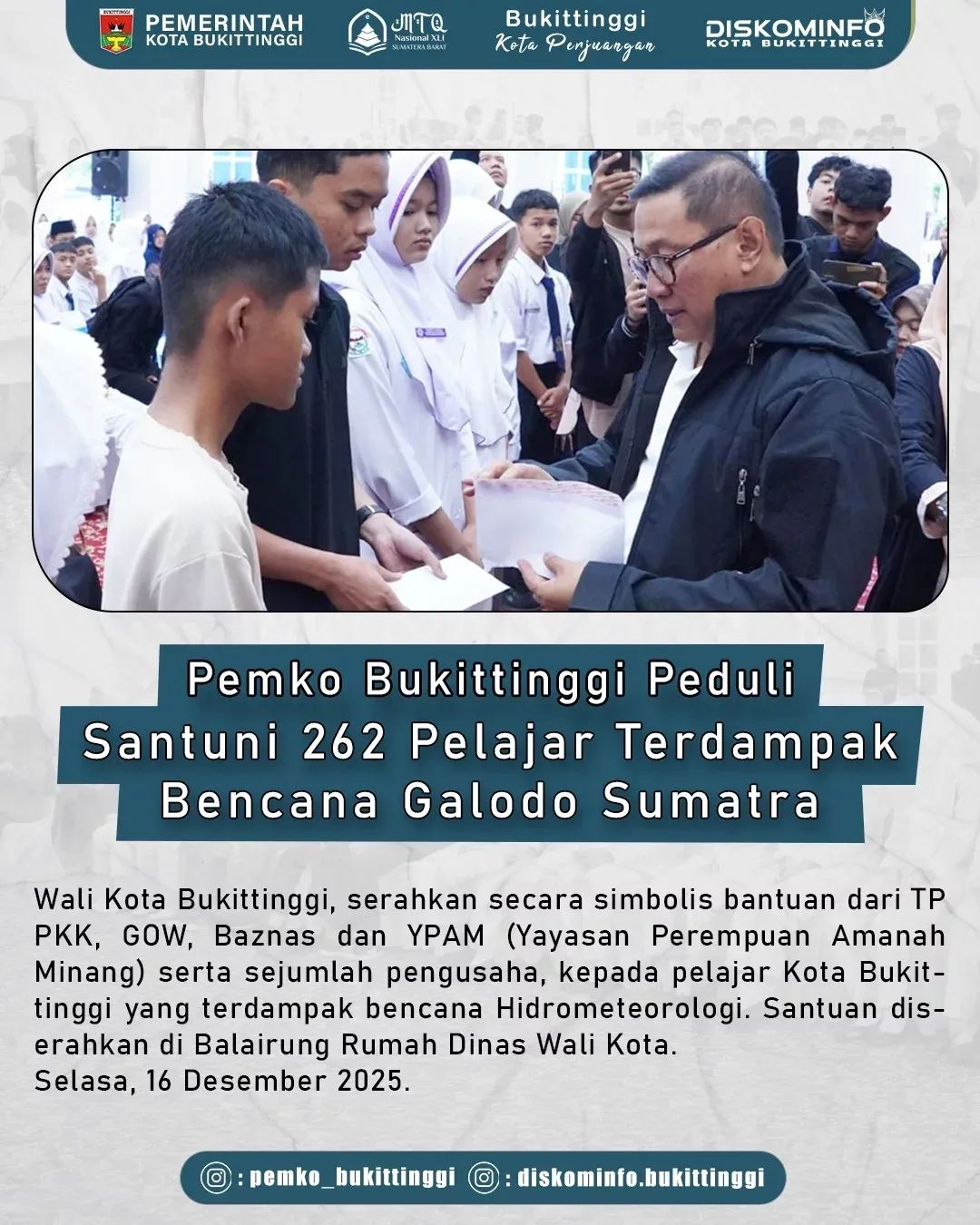 Reformasiaktual.com//Bukittinggi — Wali Kota Bukittinggi, serahkan secara simbolis bantuan dari TP PKK, GOW, Baznas dan YPAM (Yayasan Perempuan Amanah Minang) serta sejumlah pengusaha, kepada pelajar Kota Bukittinggi yang terdampak bencana Hidrometeorologi. Santuan diserahkan di Balairung Rumah Dinas Wali Kota, Selasa, 16 Desember 2025.