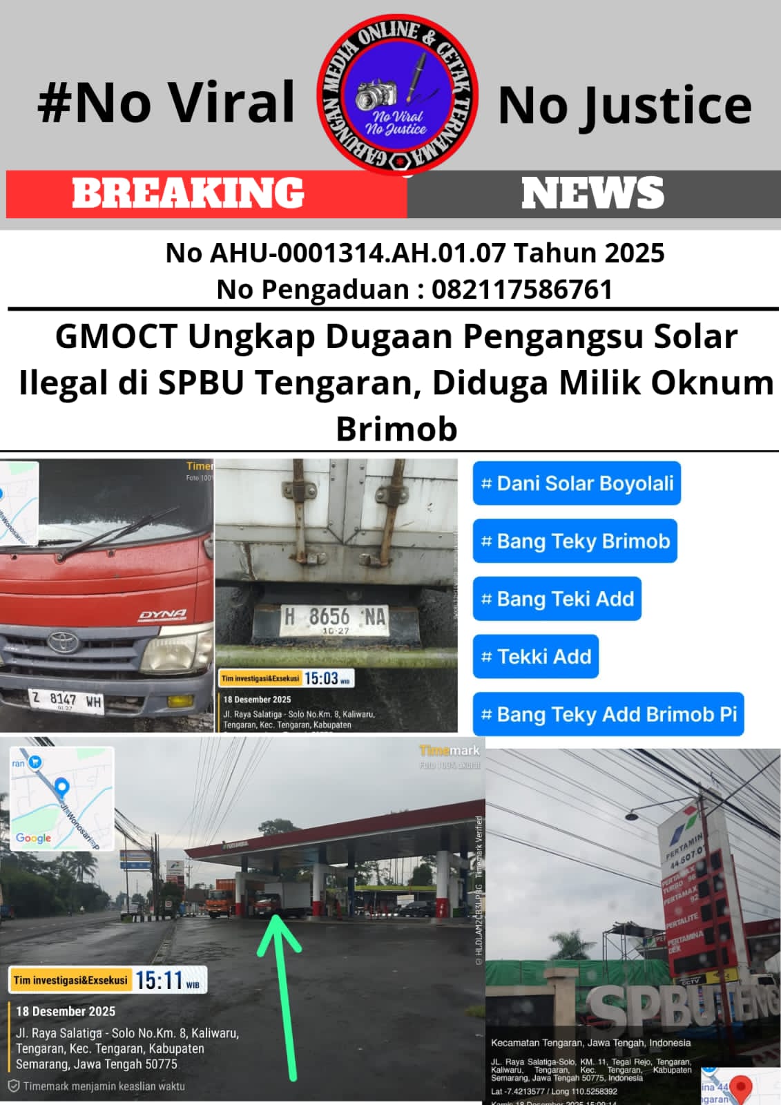 SEMARANG, 19 Desember 2025 (GMOCT) – Gabungan Media Online dan Cetak Ternama (GMOCT), melalui informasi yang diperoleh dari media online Katatribun yang tergabung di dalamnya, telah mendapatkan temuan terkait praktik pengangsu solar bersubsidi ilegal di salah satu SPBU yang berlokasi di Tengaran, Kabupaten Semarang.