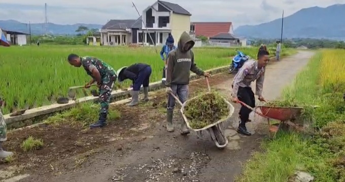 Majalengka – Dalam rangka menjaga kebersihan lingkungan, Bhabinkamtibmas Polsek Cikijing Polres Majalengka Polda Jabar Bripka Achmad Supriyono bersama Anggota Koramil 1705 Koptu Harry Pramono dan warga sekitar bergotong royong dalam kerja bakti membersihkan jalan di Desa Banjaransari, Kecamatan Cikijing, Kabupaten Majalengka.