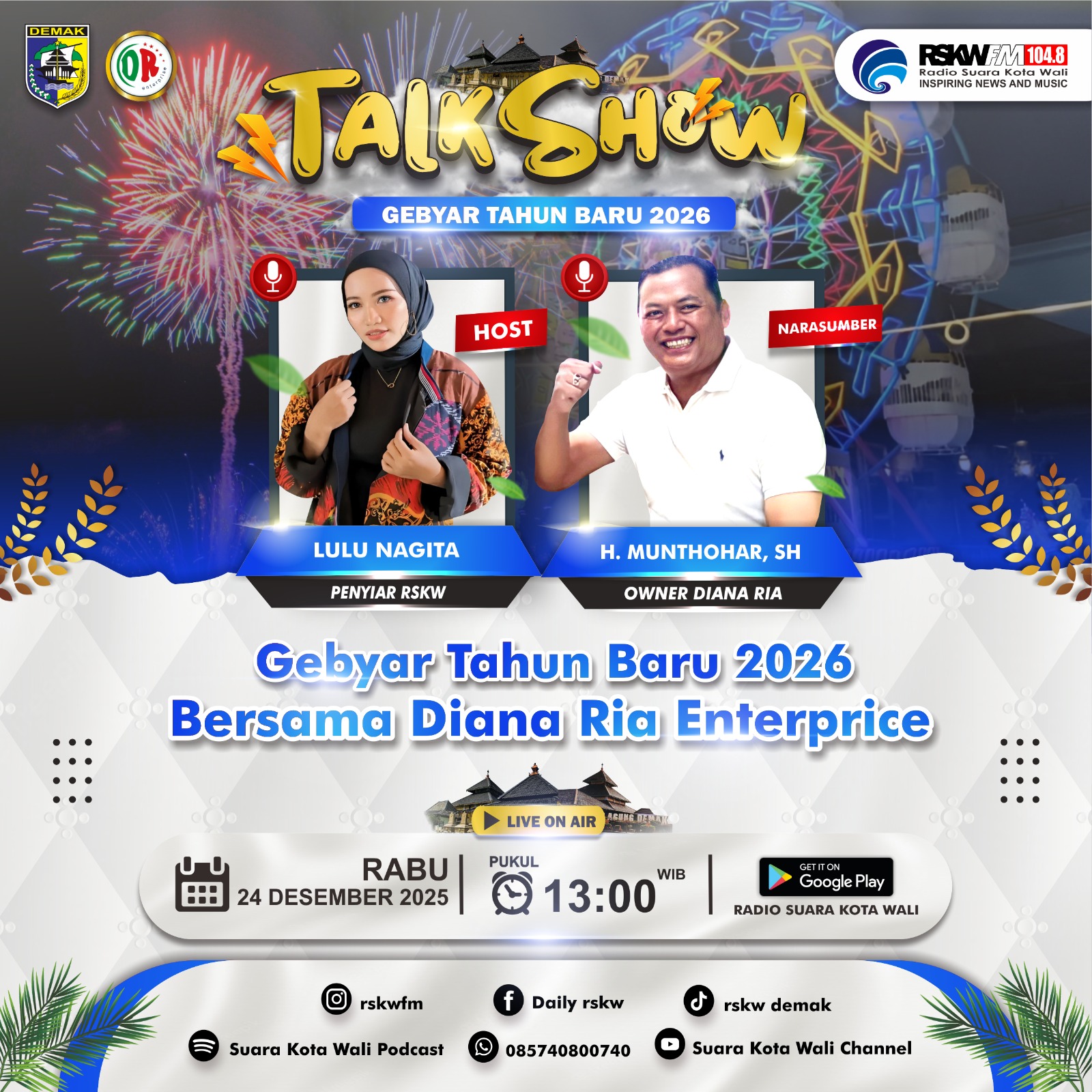 DEMAK – Radio Suara Kota Wali (RSKW) FM 104.8 akan menggelar talk show spesial menyambut Gebyar Tahun Baru 2026 bersama Diana Ria Enterprice. Acara ini akan disiarkan langsung pada: