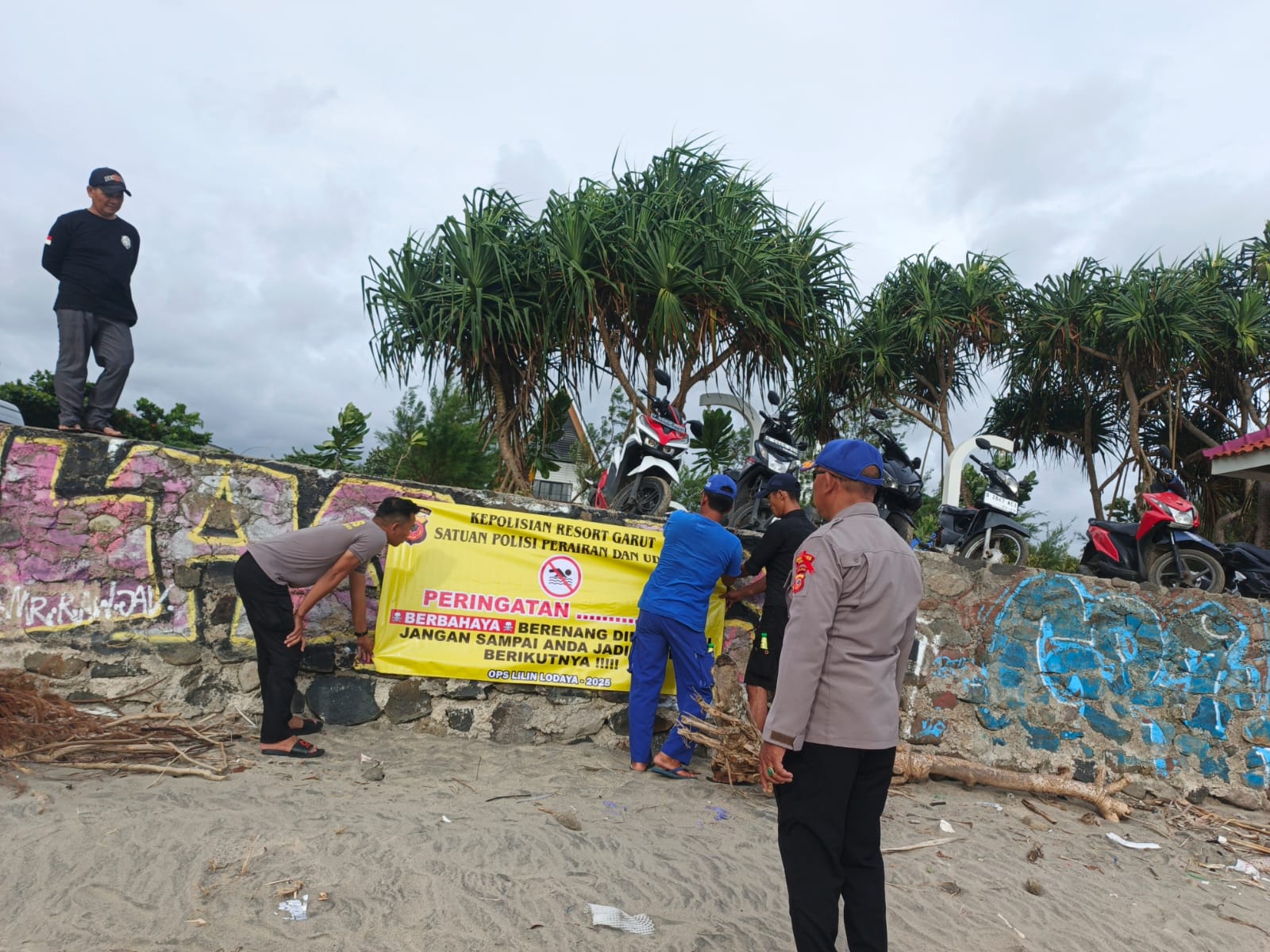 Selain memberikan himbauan secara langsung, personel Sat Polairud Polres Garut juga melakukan pemasangan spanduk larangan berenang di titik-titik pantai yang dinilai berbahaya.