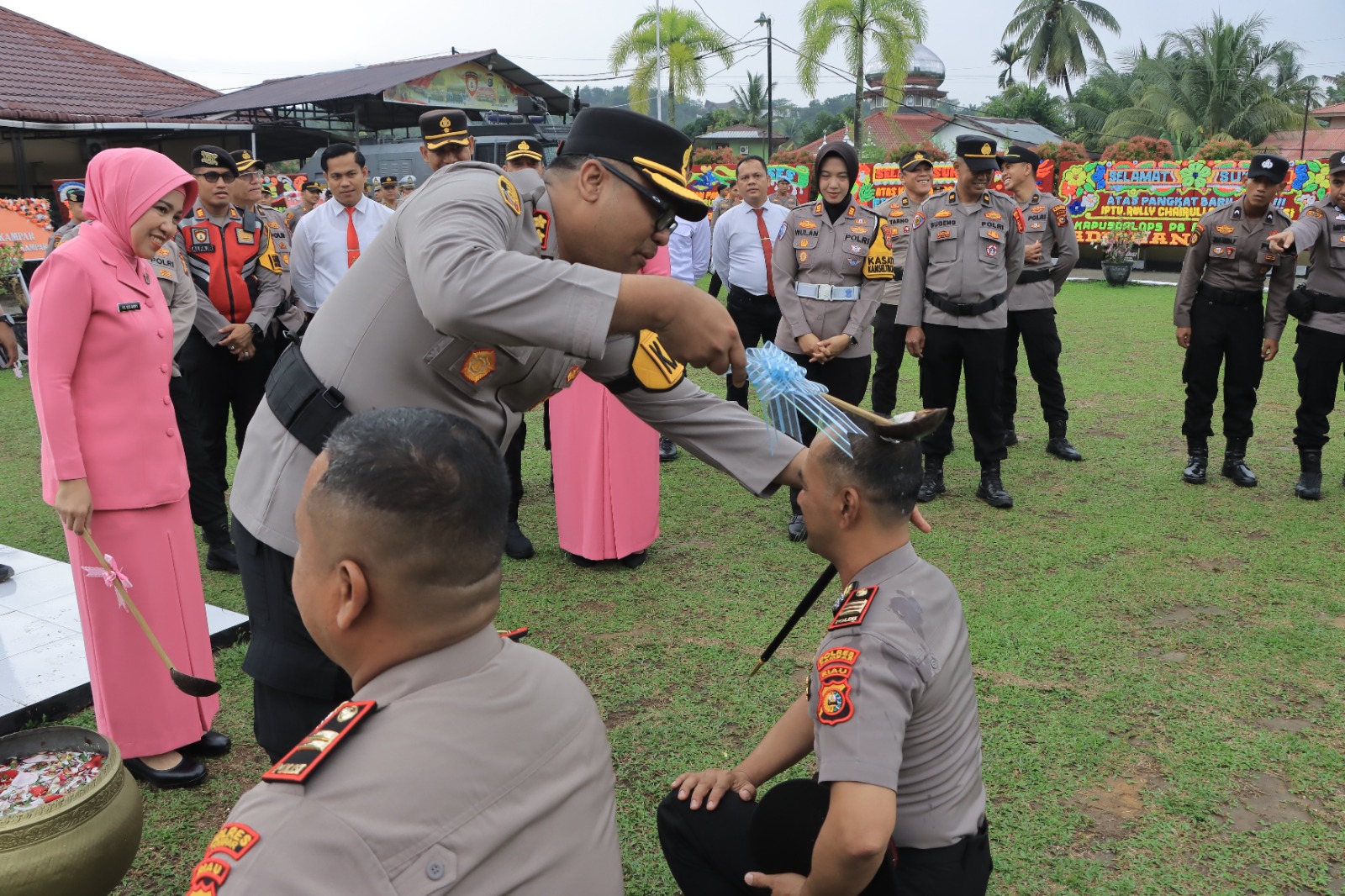 Dalam upacara tersebut, Kapolres Kampar menyematkan tanda pangkat baru kepada perwakilan personel yang naik pangkat, sebagai simbol penghargaan atas dedikasi dan pengabdian mereka kepada institusi Polri.