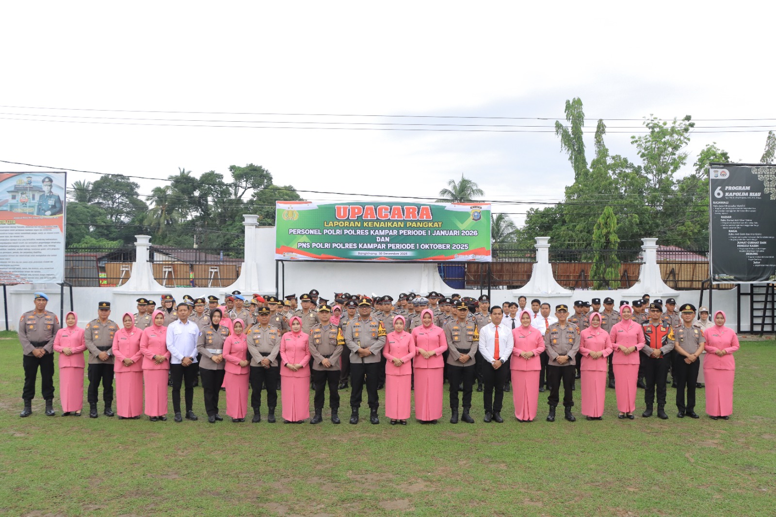 KAMPAR – Polres Kampar menggelar upacara laporan kenaikan pangkat personel Polres Kampar periode 1 Januari 2026, Selasa (30/12/2025) pukul 07.00 WIB di lapangan hijau Mapolres Kampar.